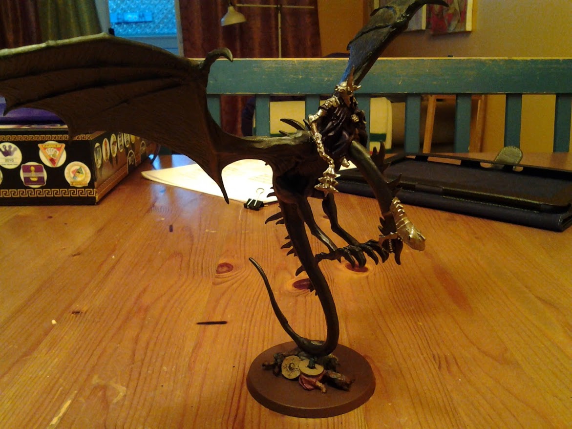 My father in-law’s favourite character from the series is Theoden. Mounted Theoden was the first model I painted for him. The Witch King on Fell Beast is a great model to place alongside mounted Theoden. I chose a dark blue for the Witch Kings robes for contrast purposes from the Fell Beast. All my bases colours are down with the exception of the fallen riders skin and hair. I am not sold on the colours I used for the riders so a change may be coming.