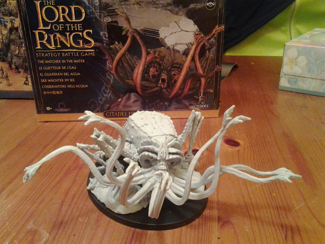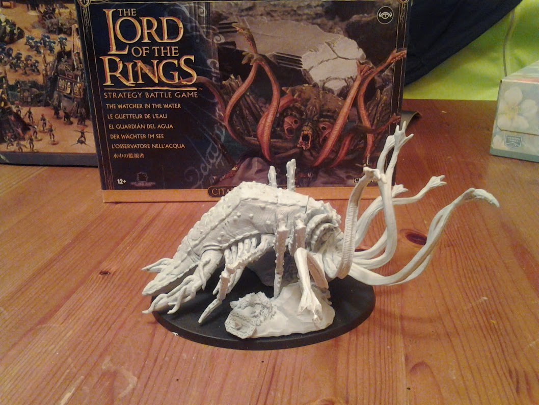 Here is my second Lord of the Rings project I have to complete by July 9. The Watcher in the Water will be a Christmas present for my brother in-law. Right now it is constructed and I have used green stuff to fill all the gaps. I have glued the model to the base yet to make it easier to paint the underbelly. I plan on using an Army Painter primer to speed up the process.