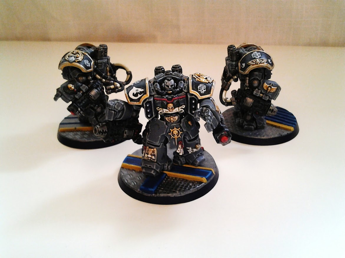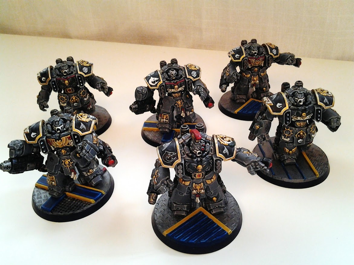 If I use one big squad of six then I use the model with the plume as the Veteran Sergeant.  If the squad is broken into two then the model without the helmet also acts as a Veteran Sergeant.  I am able to distinguish between the two squads with the shoulder crests.  One squad has a skull and the other a shark fin.  I also put shark teeth on the shoulders of the Veteran Sergeants.  All transfers are from Forgeworld.