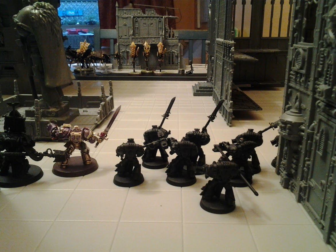 We roll for deployment and I win the honour. Purifiers and a squad of Terminators hold my right flanks. The Librarian with the other Terminator squad take the center with the Dreadknight holding the left and the Interceptors claiming the building behind the Librarian.