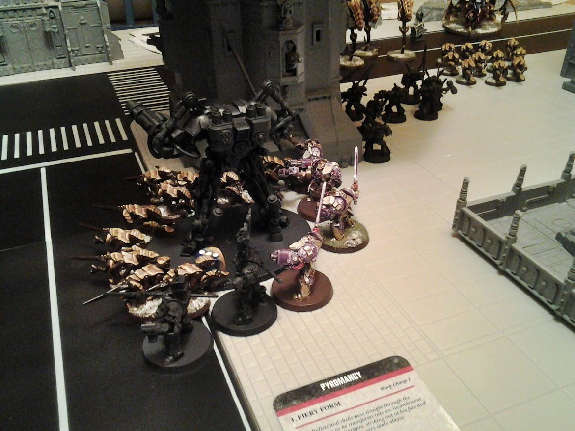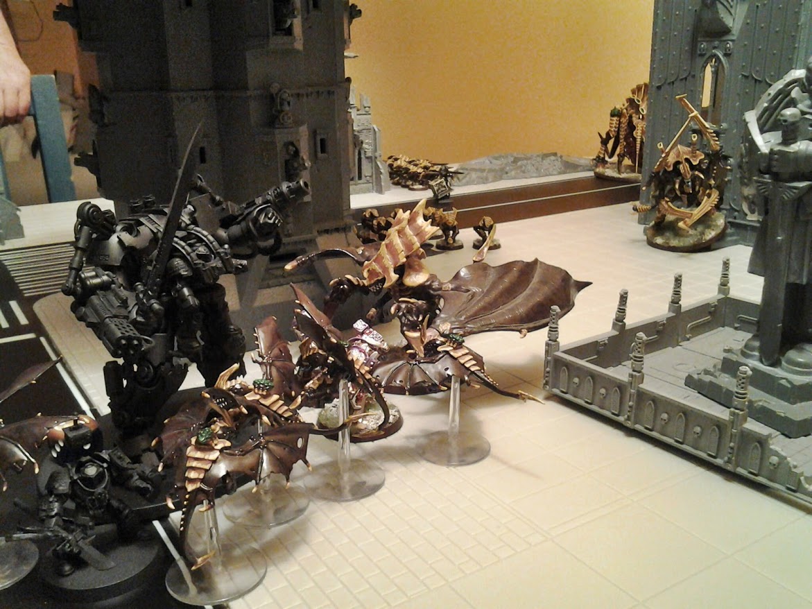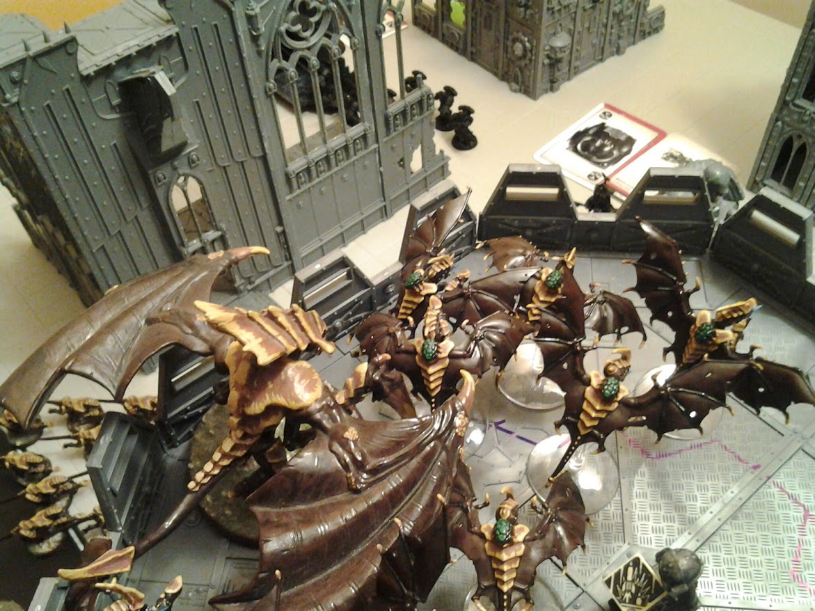 The Librarian and Flyrant duel and essentially fist bump each other. The Dreadknight and Terminators reduce the numbers of Gargoyles and Termagaunts but lose one of their own in the process.