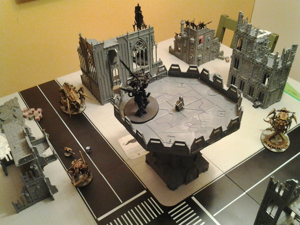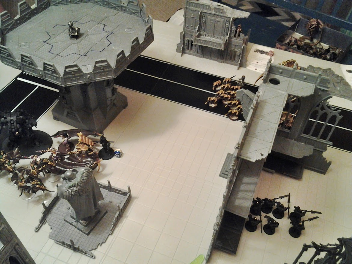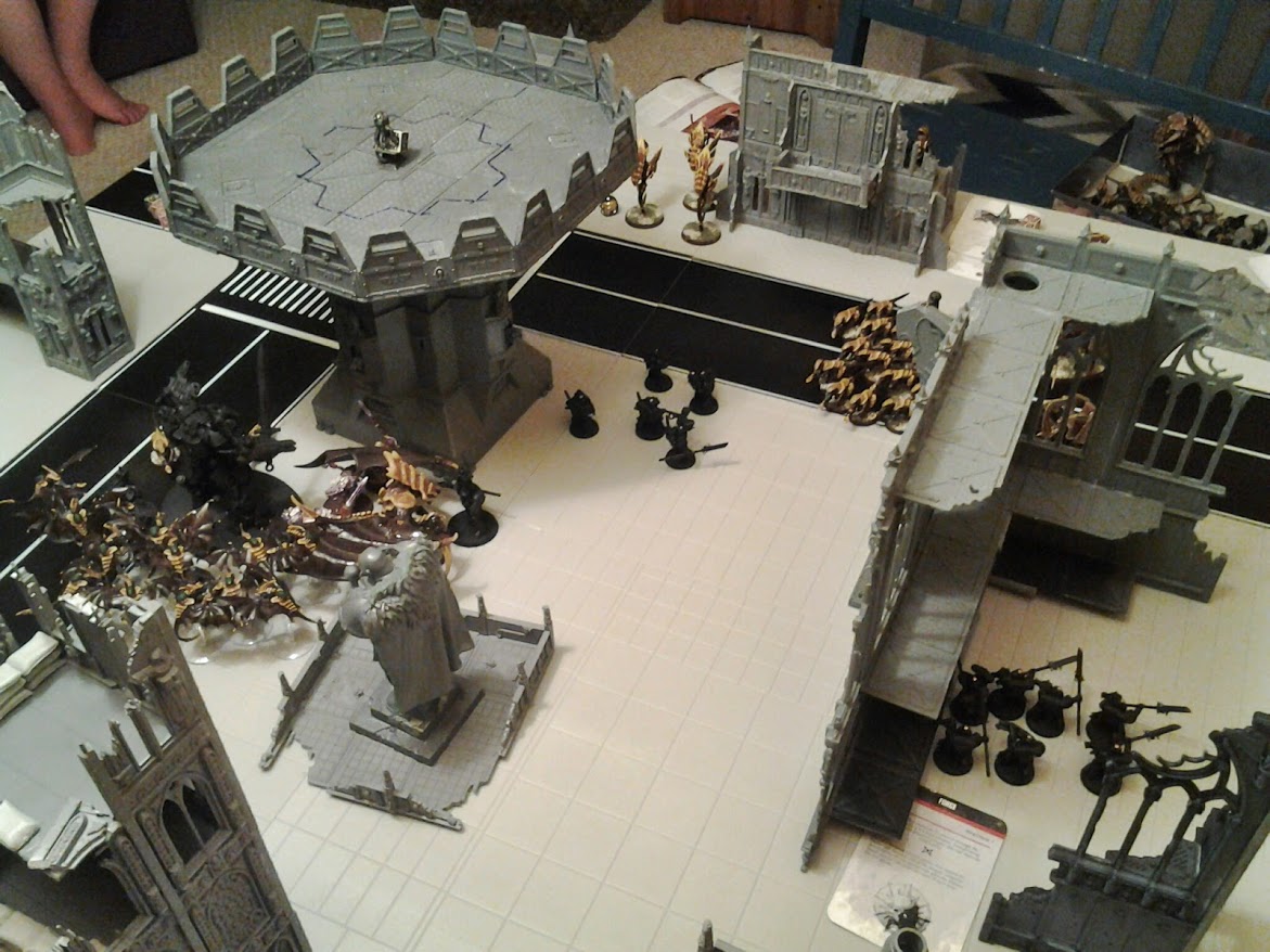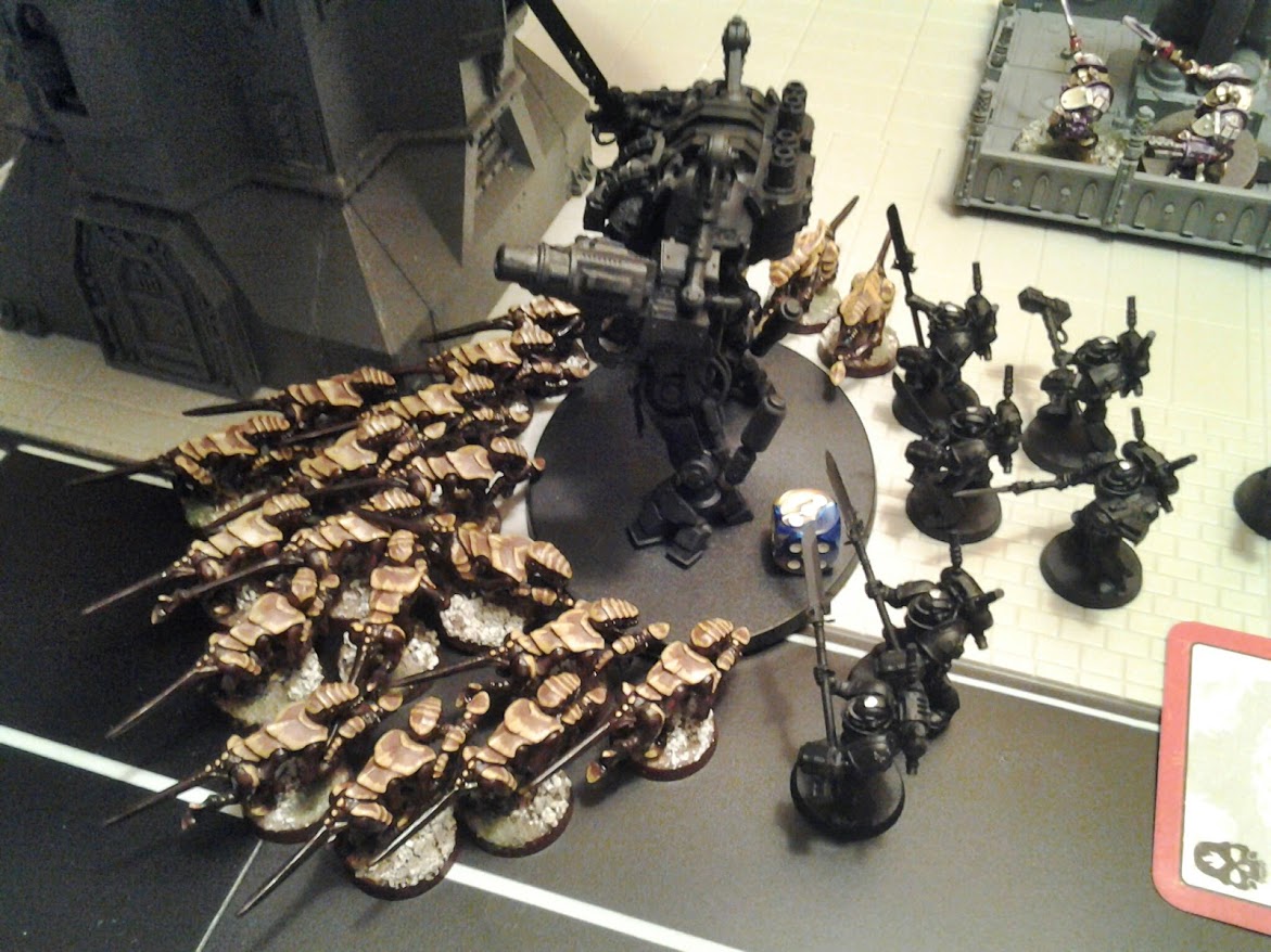 The Librarian and Flyrant duel and essentially fist bump each other. The Dreadknight and Terminators reduce the numbers of Gargoyles and Termagaunts but lose one of their own in the process.