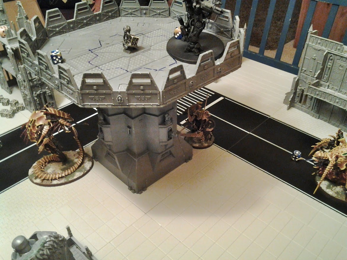 The Grey Knights see the strategy of the Tyranids and split forces. The Terminators run back to their objective to secure and protect it. The Dreadknight jumps into the ruins in the Tyranids deployment zone and incinerates some Termagaunts. The Dreadknight activates his force weapon and does his best Bruce Lee impression calling over the Swarmlord with a flick of his wrist.