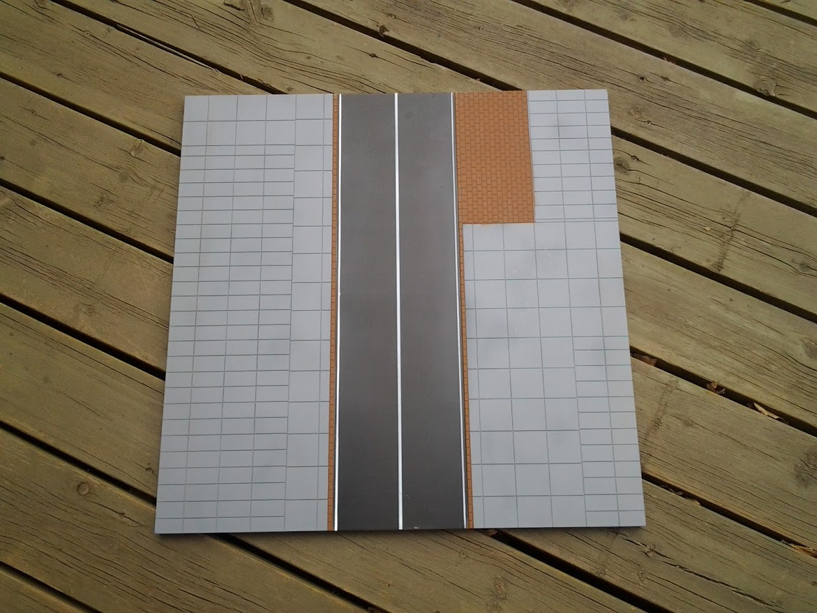 I started with painters tape on the roads.  I then primed the boards black.  This is to make sure that I get all the grooves in the bricks.  The next step was using Army Painter Uniform Grey primer.  It was a bit thinner on some parts, allowing the black to show a little.