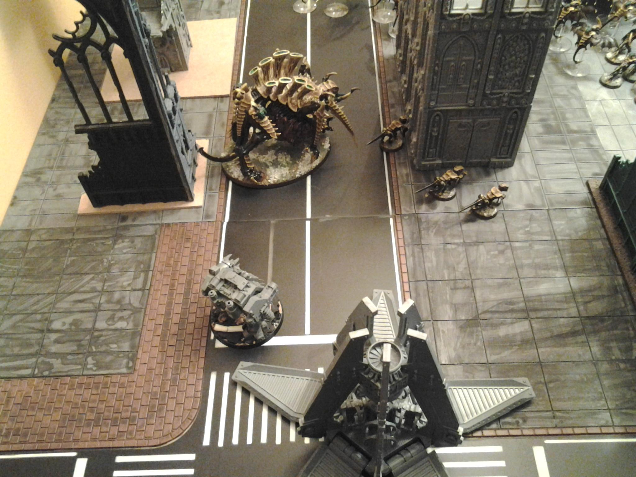 The Termagants pass synapse and make their way towards the protection of the Tervigon. The Warriors close in on the Gargoyles to offer Synapse support. They charge the Land Speeder and destroy the vehicle. The three Termagants that survived the flames of the Dreadnought had followed the Warriors and stayed at the ruins in the centre. They await their chance to strike at the Terminators.