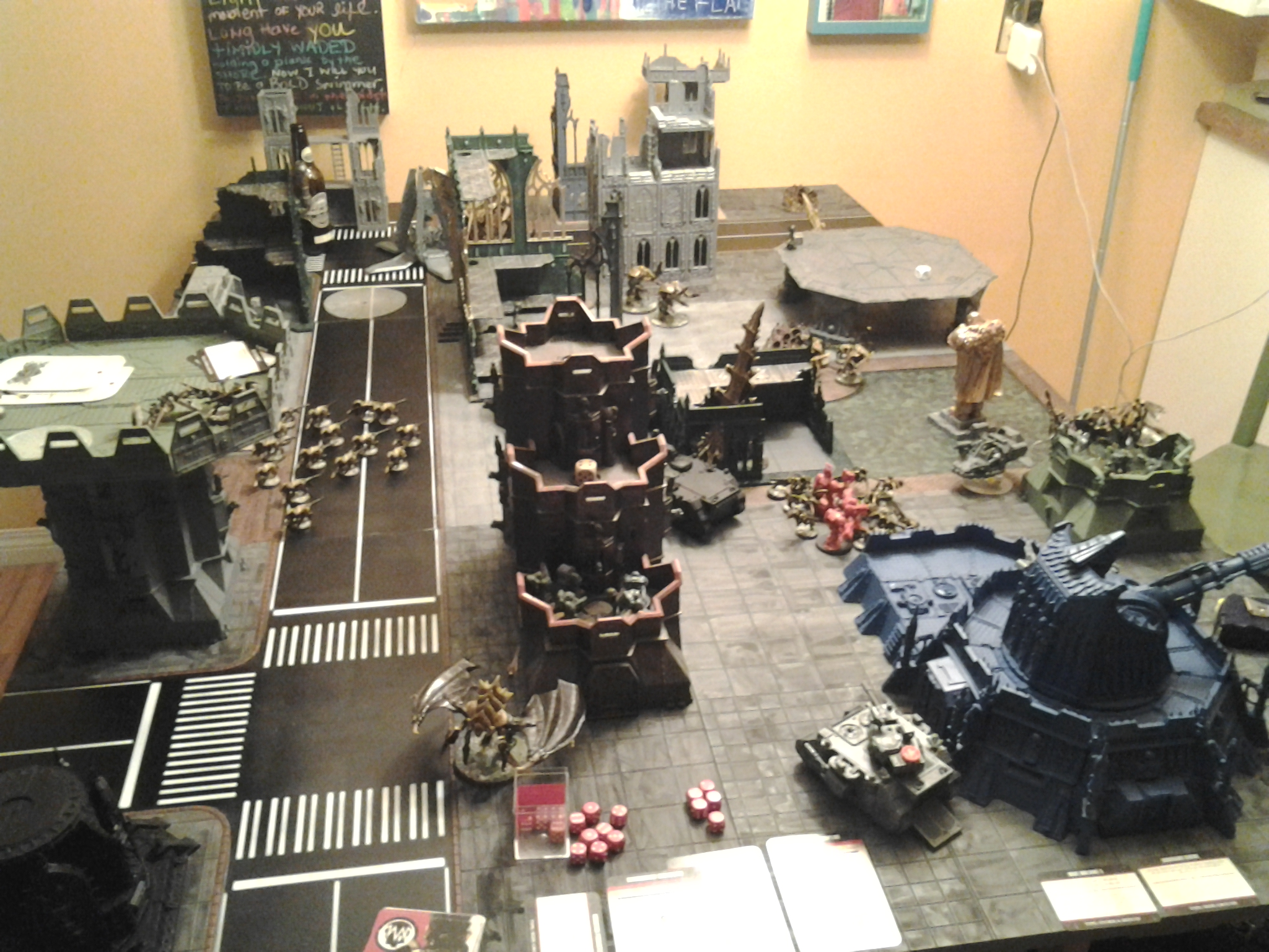 We decide to keep it simple since it is our first game of Cities of Death. We play the first mission Firesweep. It involves deploying in table quarters. Each turn we draw up to three Cities of death objective cards. You cannot hold more than three cards. The table gets loaded up with terrain.