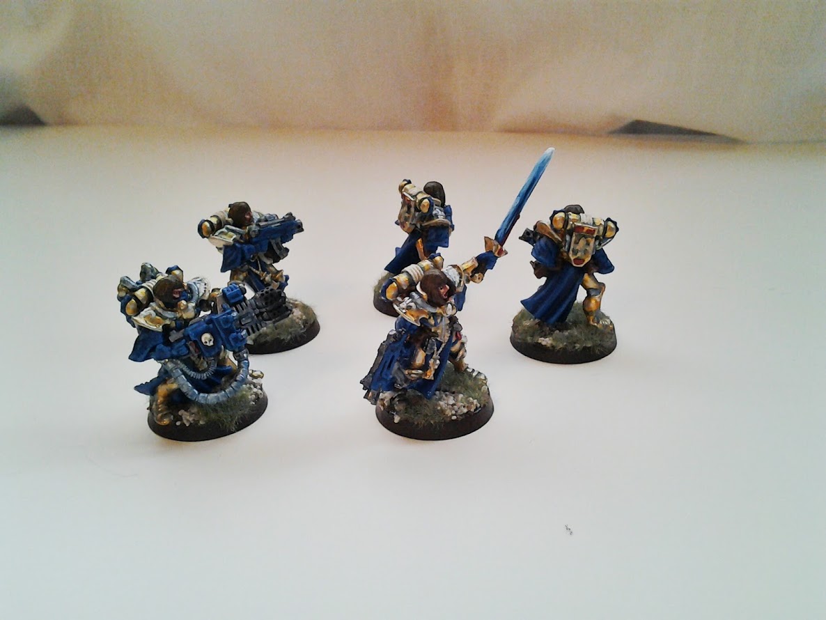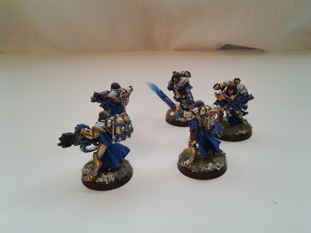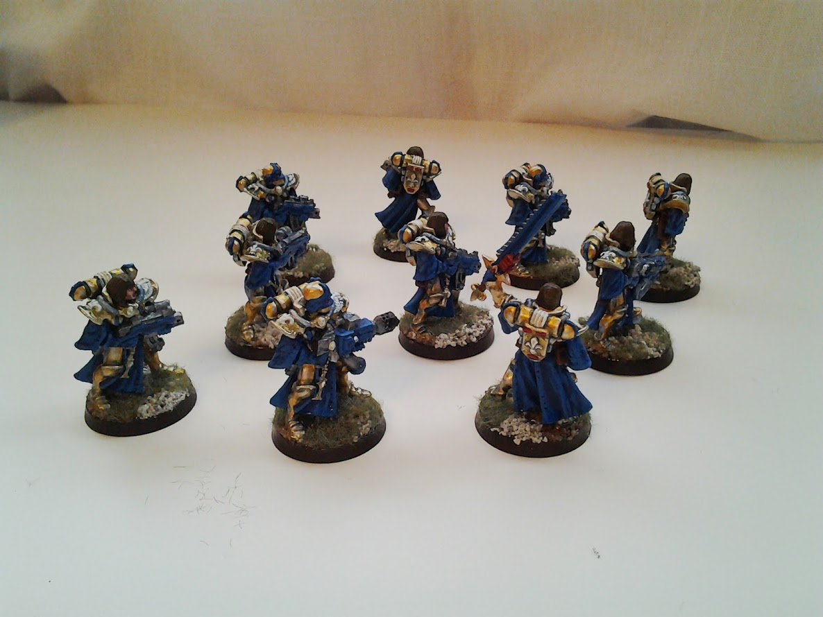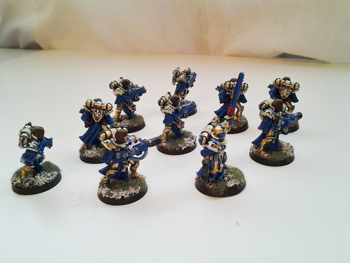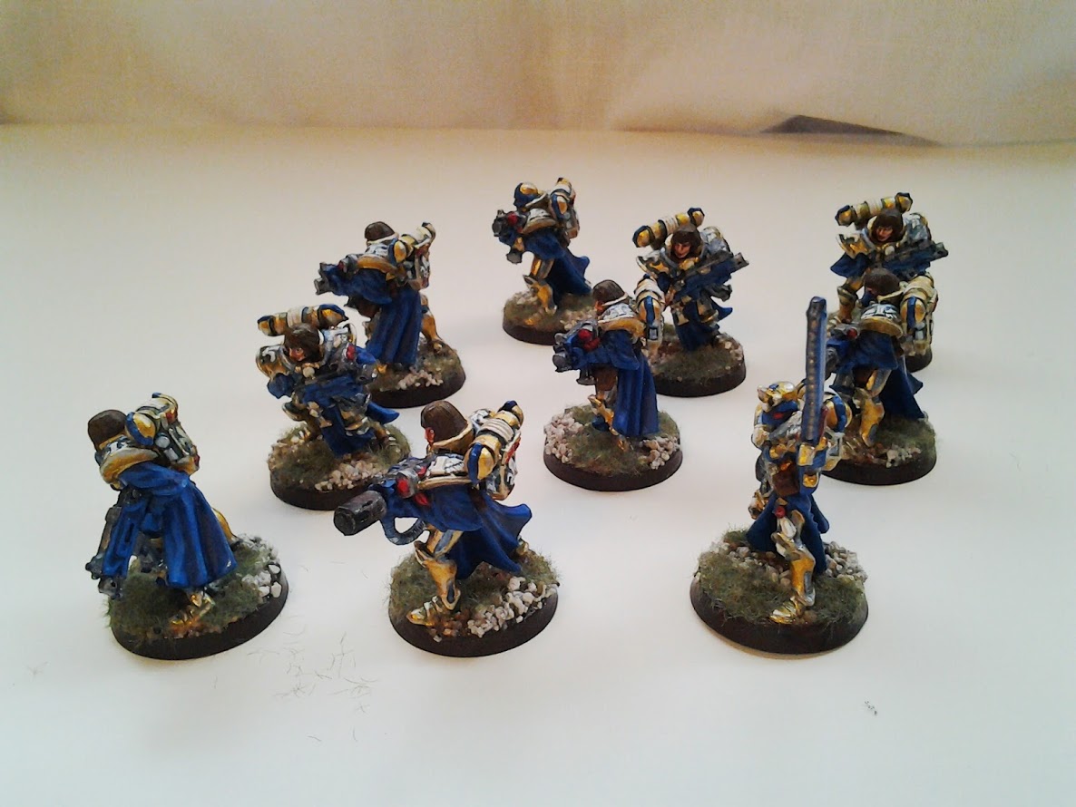 The gold and blue provide a striking contrast on the board. The white and red compliment the ensemble. The power armour is ornate and I think the gold suits it well.