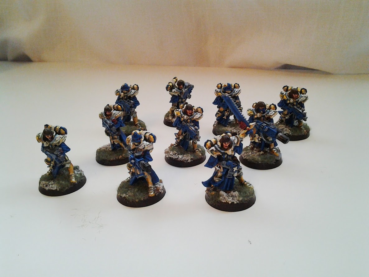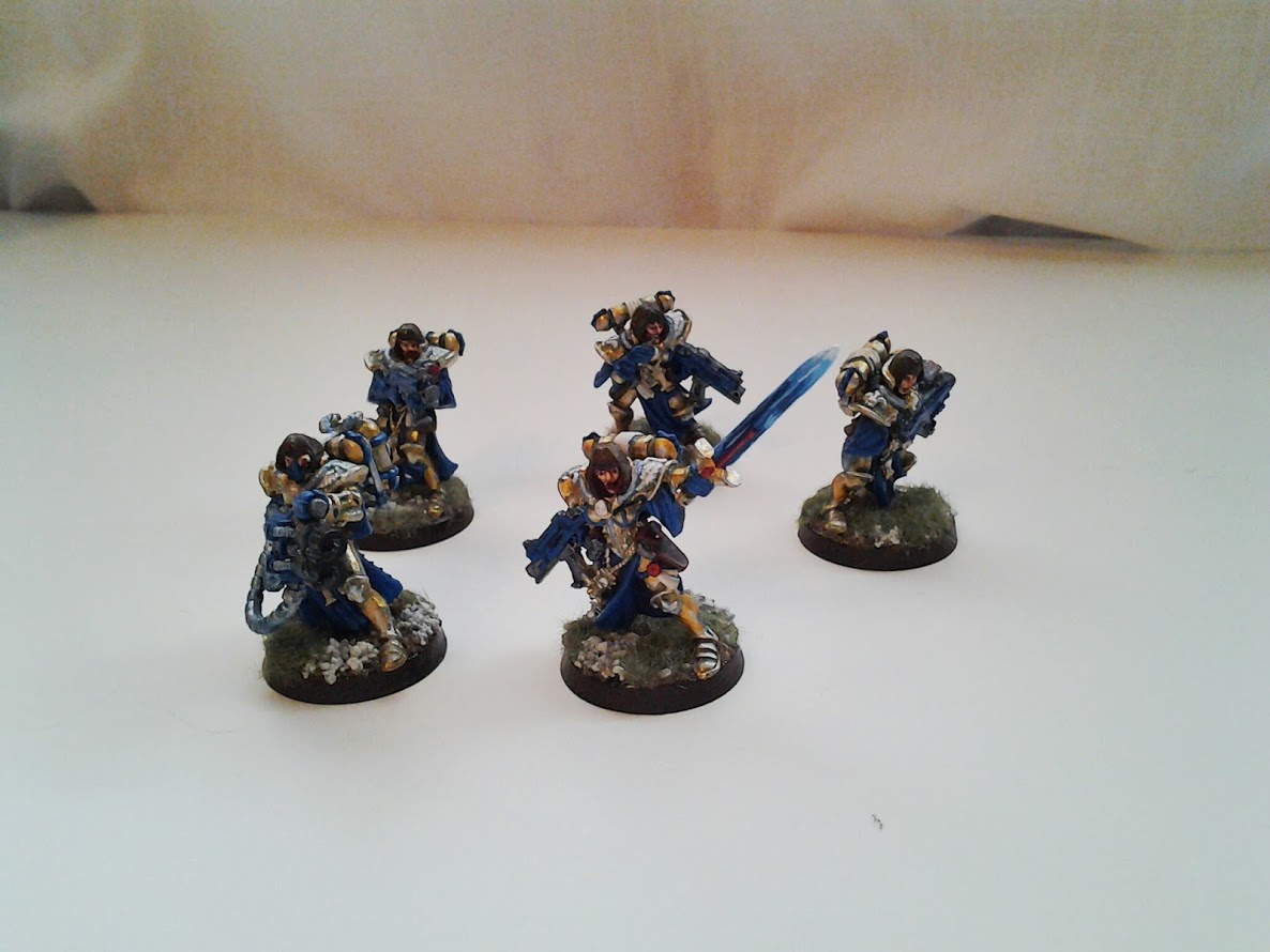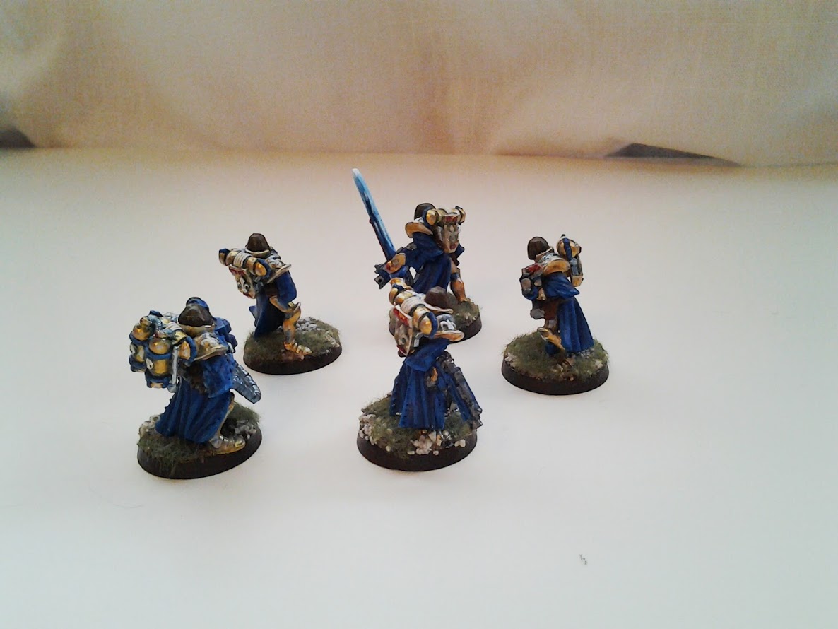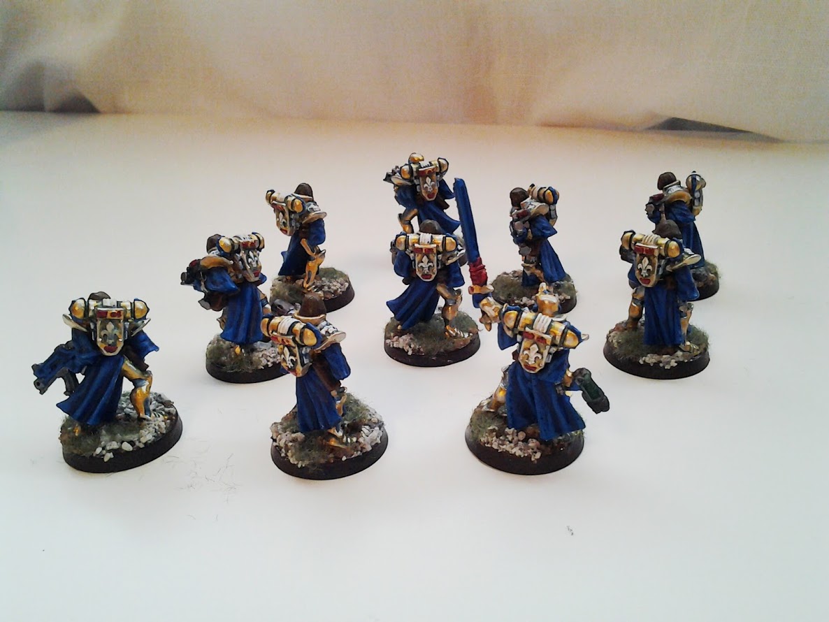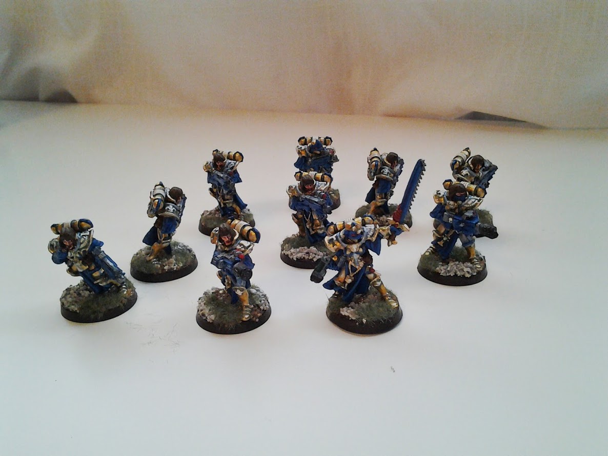 The gold and blue provide a striking contrast on the board. The white and red compliment the ensemble. The power armour is ornate and I think the gold suits it well.