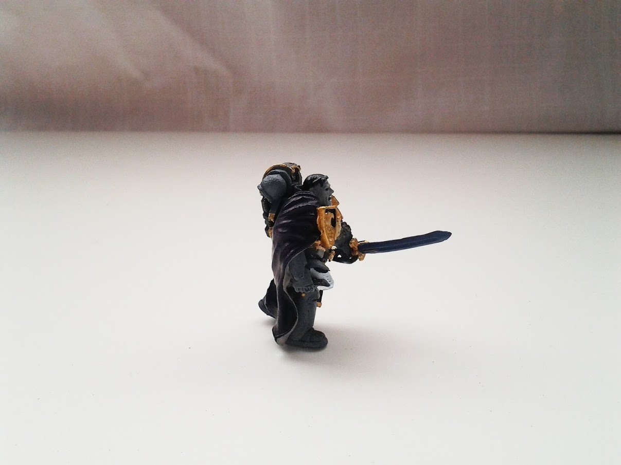 At this stage all the base colours are on. It was primed with Army Painter Uniform grey. Three layers of Burnished Gold were applied. For the other colours I used Abaddon Black, Midnight Blue on the cloak (a discontinued colour years ago), Royal Blue for the sword and Rakarth Flesh for the inside of the cloak. The next step will be dipping the model in varnish to seal the colours. I find that the paint rubs off of the Forgeworld models so the varnish is a good seal and everything I paint on afterwards doesn’t rub off.
