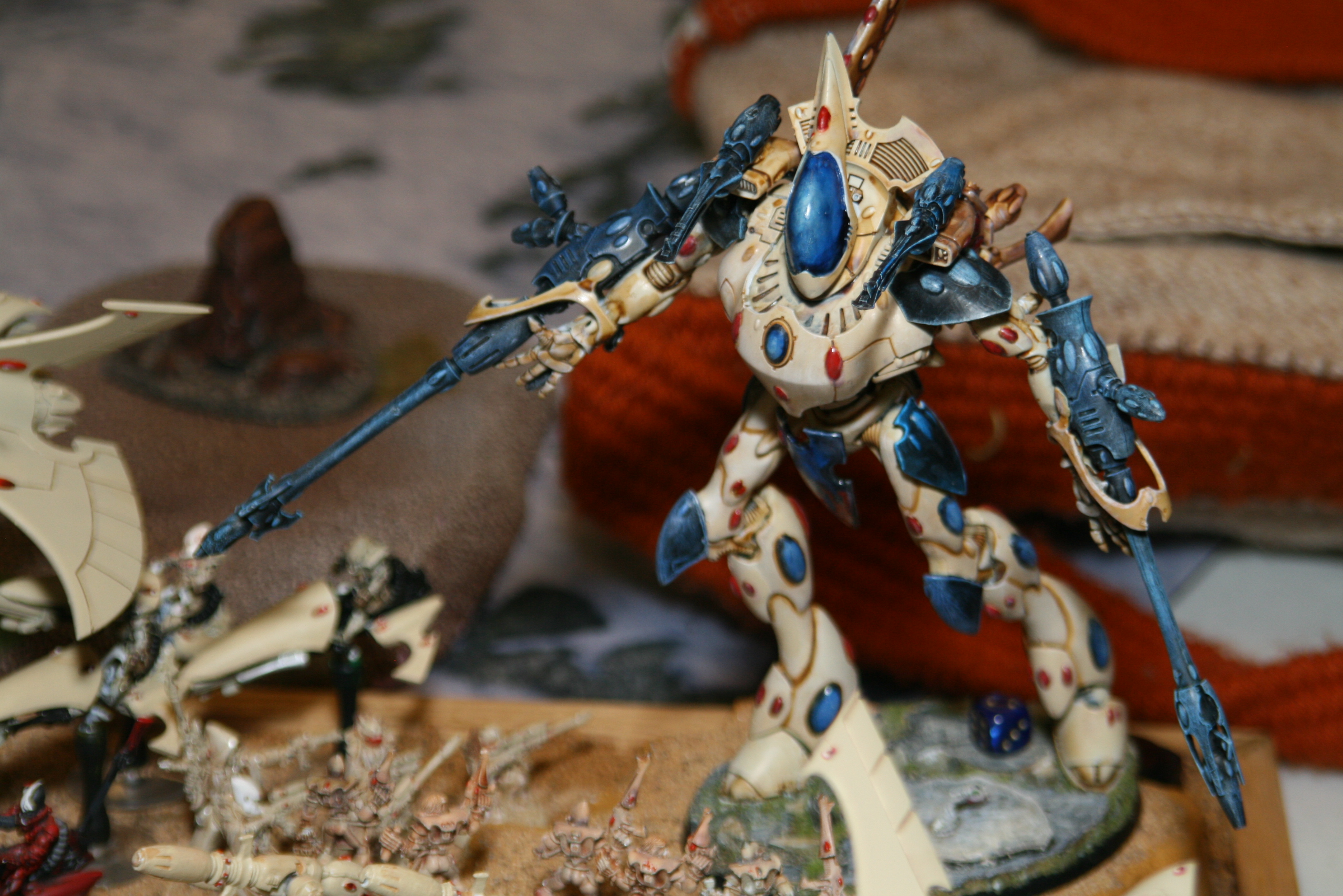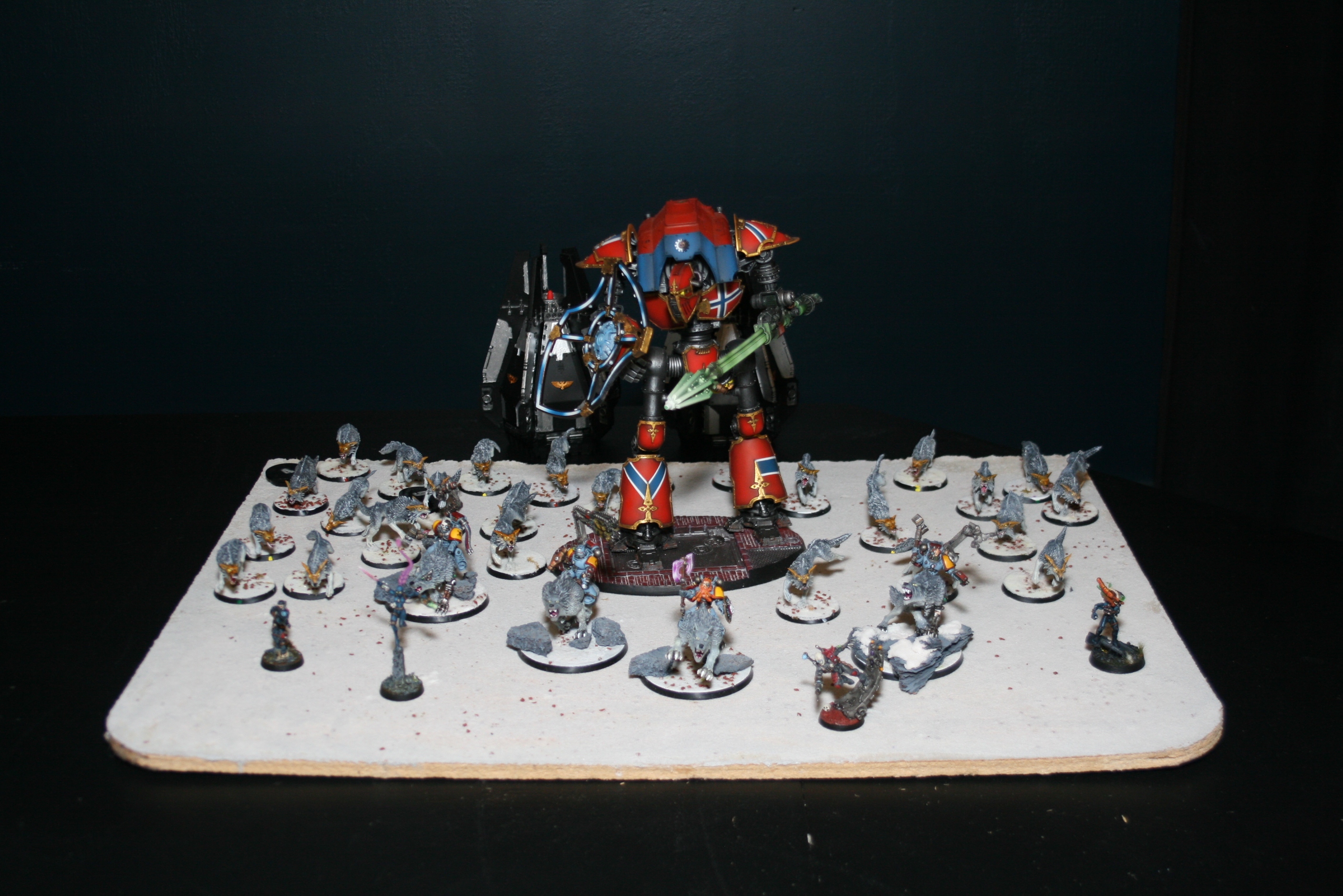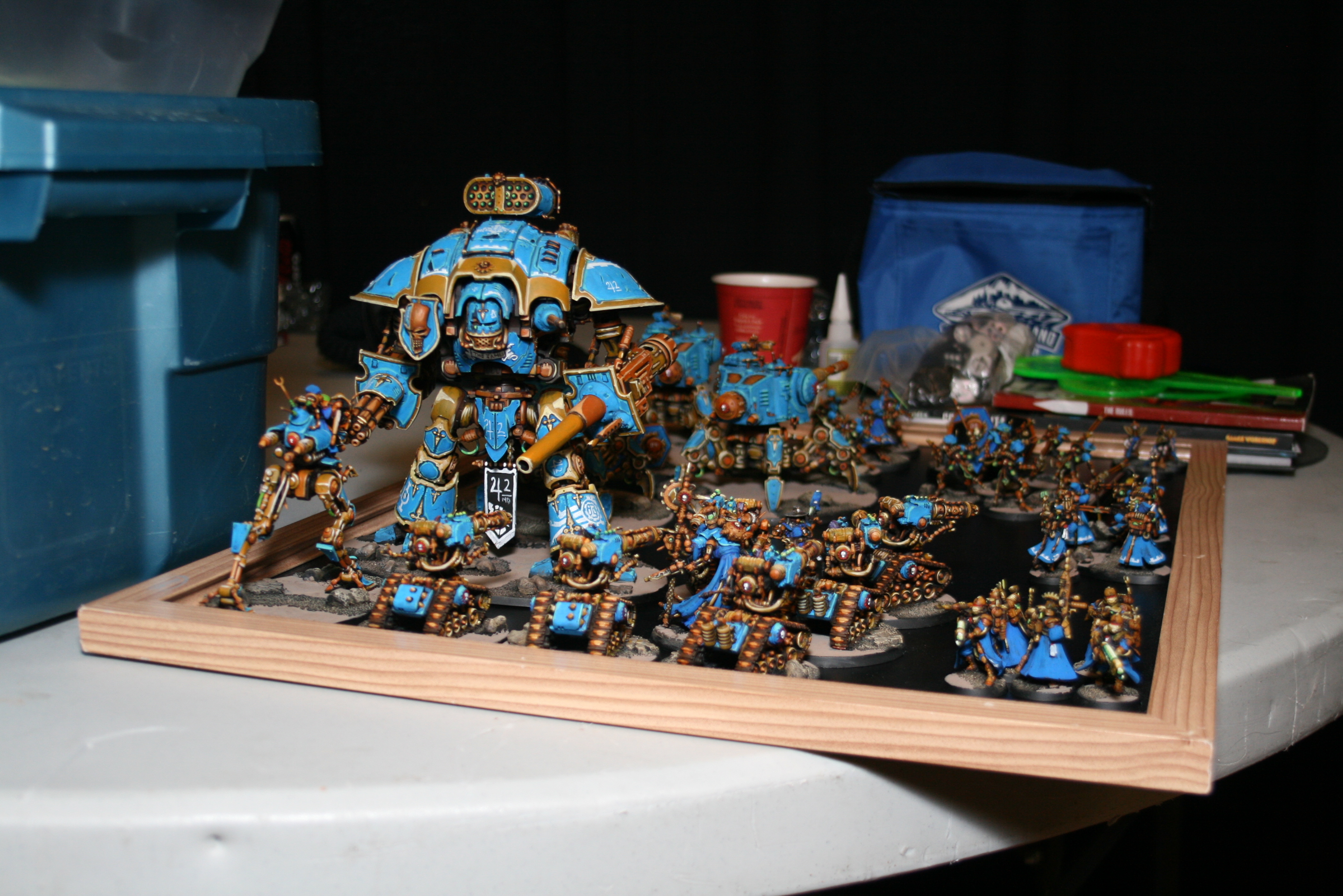 I think the only army that wasn’t represented was Chaos Space Marines.  Chaos Space Marines may have shown up but I don’t recall seeing them.  There was one Adeptas Sororitas player who allied in Blood Angels and maybe Space Marines.  There was one Tyranid player and he was a no show on day two.  I can’t recall seeing a Flyrant on the table.  It will be nice to see more Tyranids out to play (mine included).  Eldar dominated the top of the standings and I am certain every single Eldar player had a Wraithknight. The solo Cult Mechanicus player took top general.  There were two Imperial Knights that made it out to the show.  There were three Ork players and one brought a Stompa.  I apologize for the quality of photos.  I have dusted the DSLR off so it will take some time to get used to working with it again.  Next time I will be sure to take photos sooner.  Sorry to everyone whose army I missed.