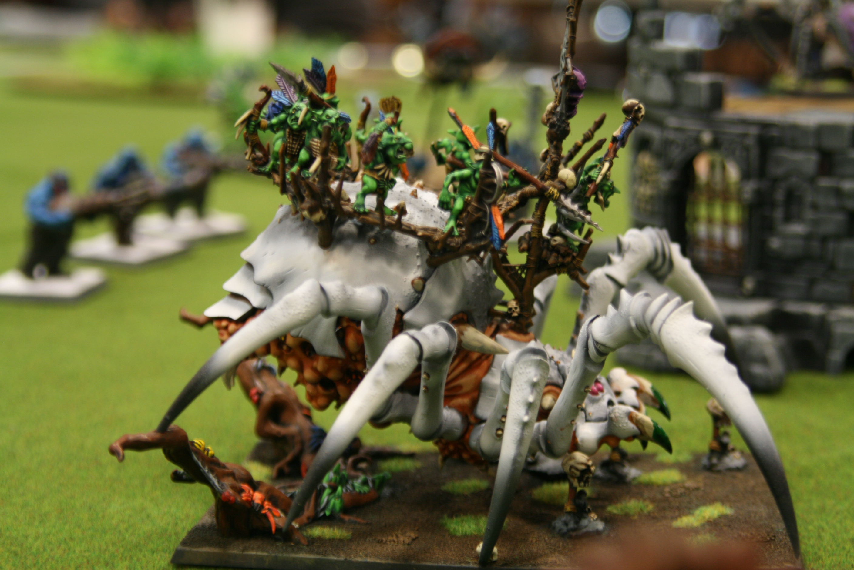 Hey, that’s not 40K.  My friend Keith was playing in the Age of Sigmar event so I popped over to his table.  He was playing an Orcs and Goblins army and I fell in love with this model.  It is tough to paint white and it was pulled off with spades.  It drew me in and I couldn’t stop admiring it.
