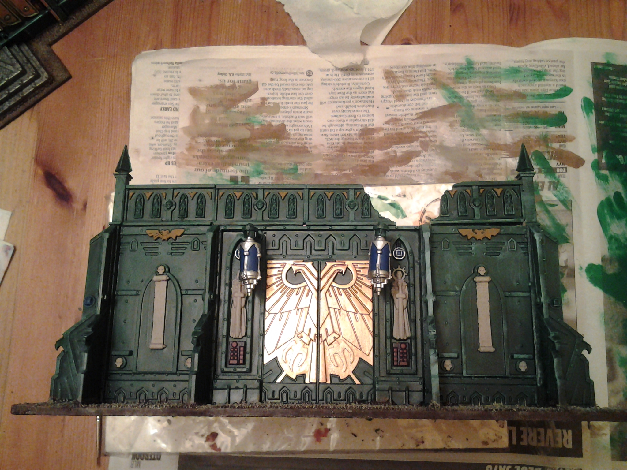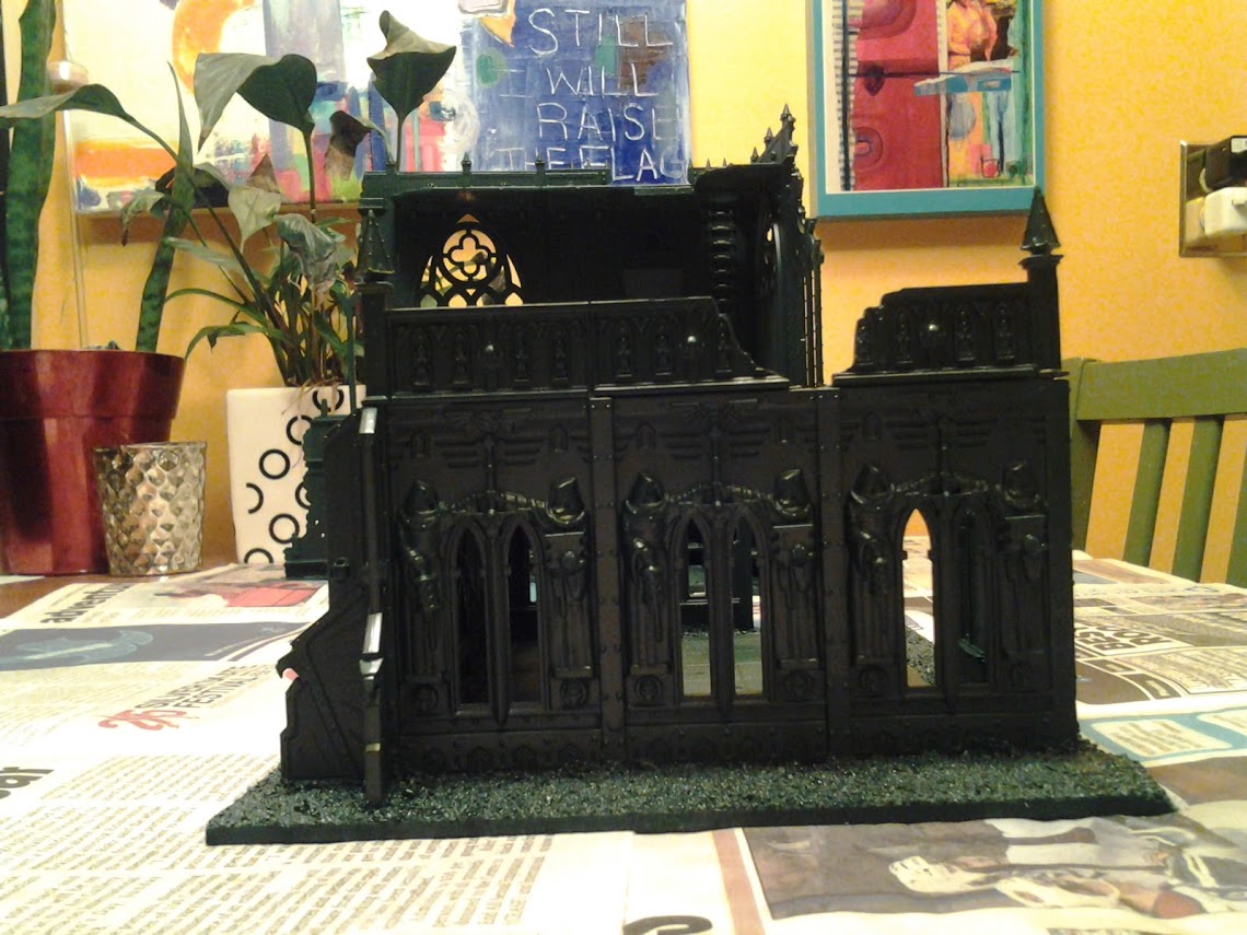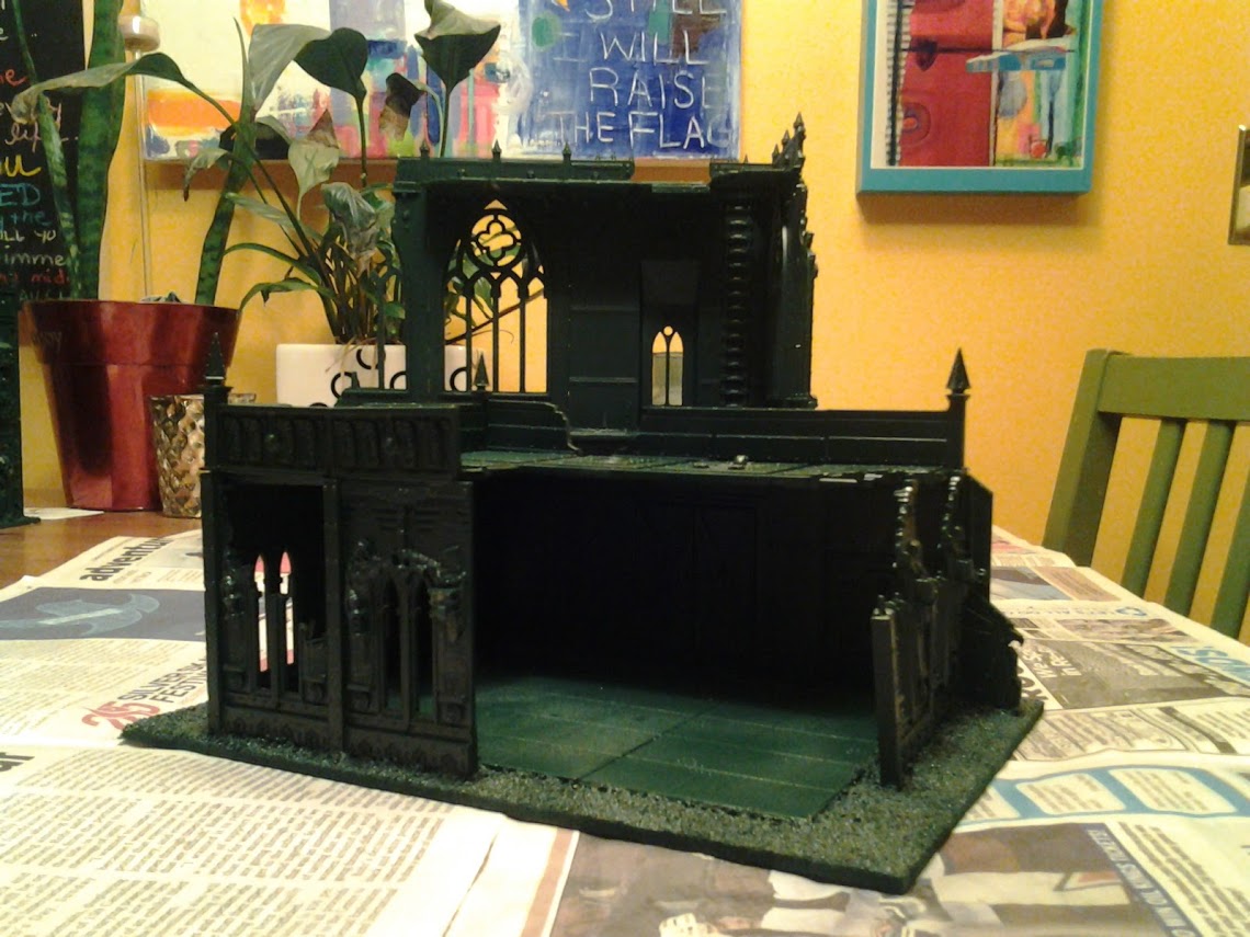 I used a Fantasy movement tray for the inside of the building. I drybrushed the building and then painted some of the decorations to provide some contrast on the building. I am still learning to use the GW drybrush line. There has to be a minimal amount of paint on the brush otherwise the terrain gets overwhelmed.