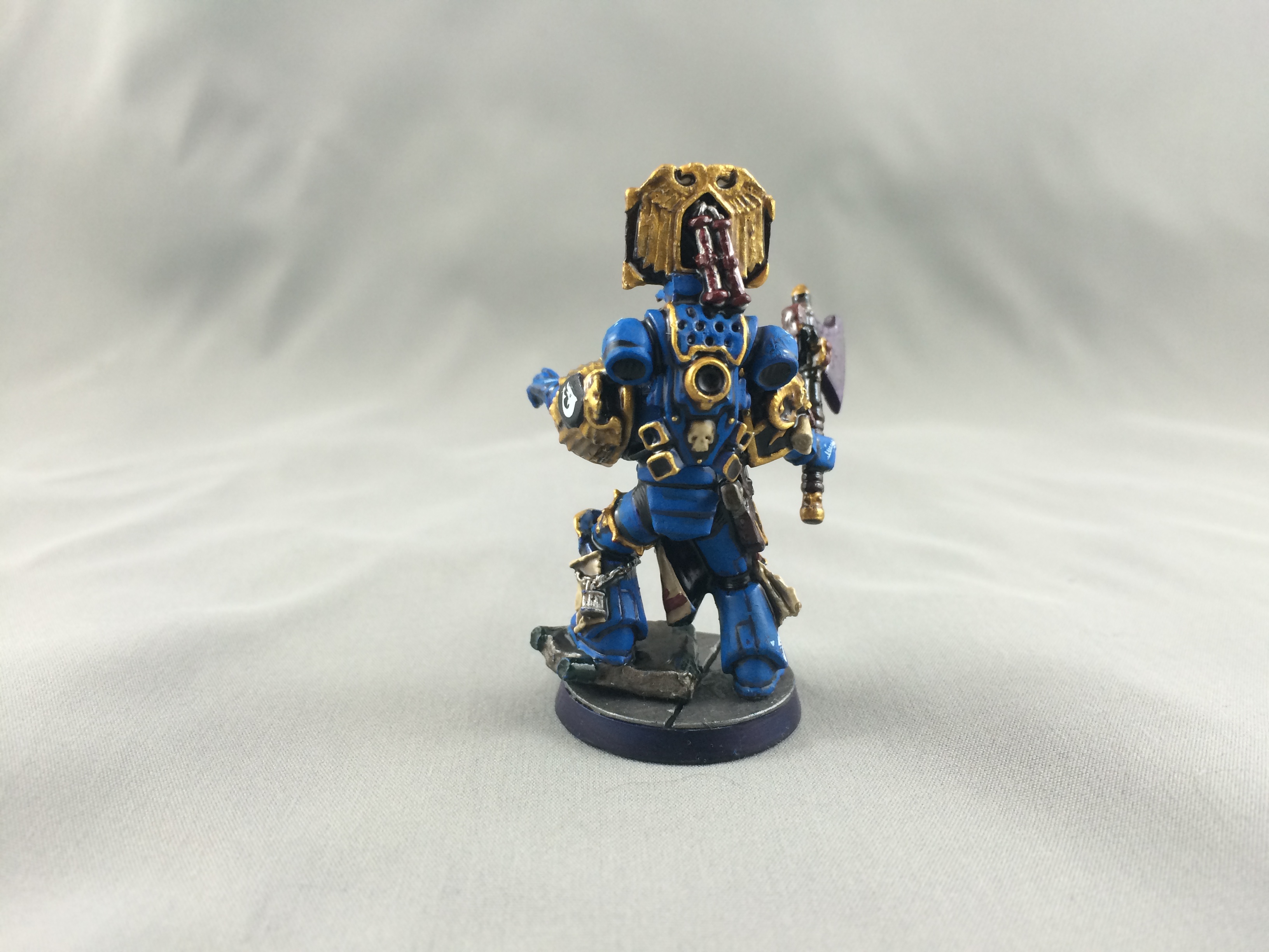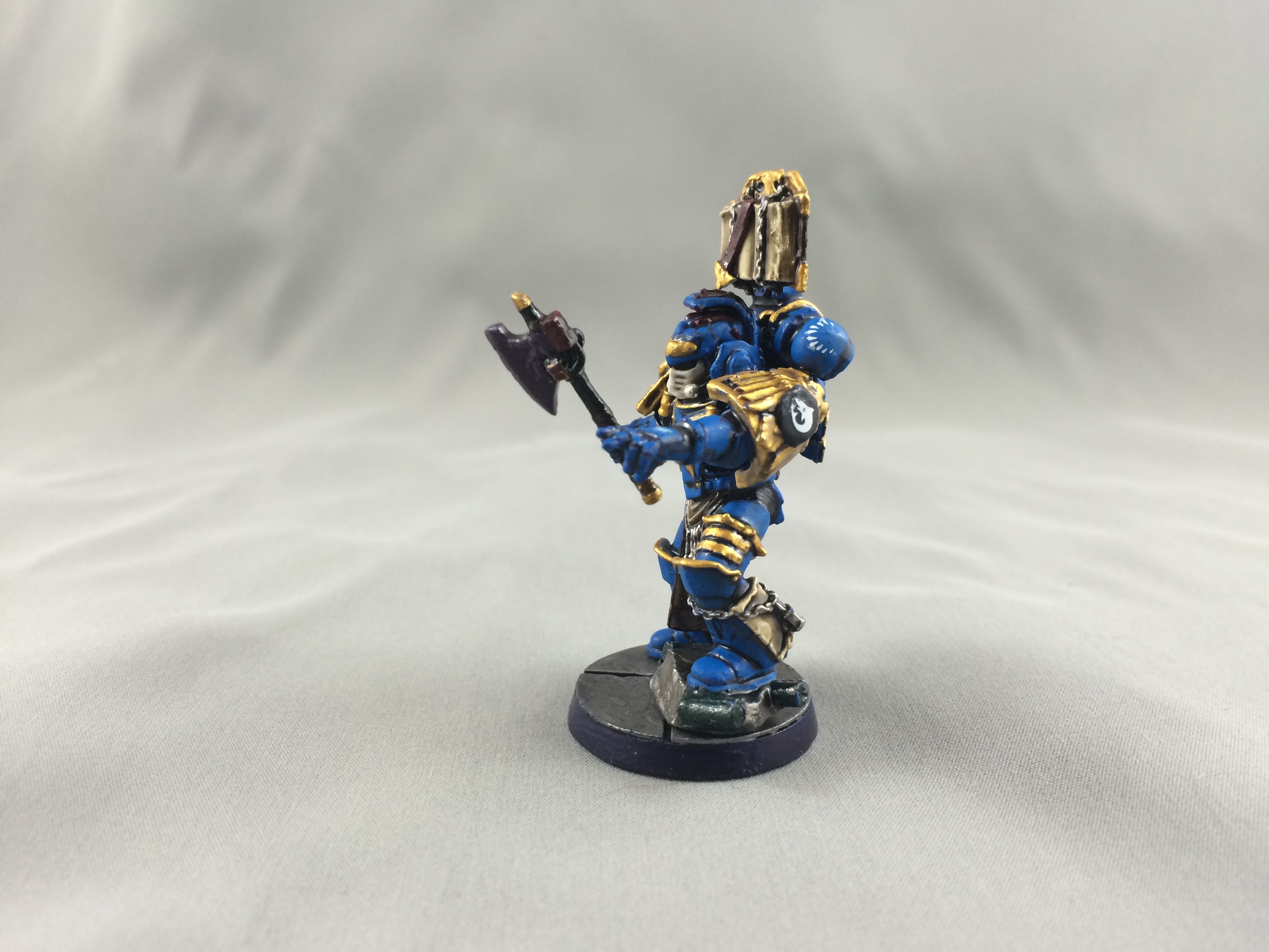 There is a big improvement compared to the last post.  I miss the ink GW sold years ago.  I find that the Army Painter shades come close to producing the kind of effect that the inks did.  The shadow is the recesses is sharp.  I went over all the blue areas with Army Painter blue.  I painted the robes and parchment as well.  the white decals pop out on the blue armour.  I wasn’t pleased with the Leadbelcher slab of metal that Loth is stepping on.  I painted it black after this photo and drybrushed it with Necron Compound.  All I have to do now is highlight the model and it’s time for Loth to have some fun on the game board.  I’ll only use the Loth rules if my opponent agrees since I’m playing Carcharodons and Loth is a Red Scorpions Librarian.