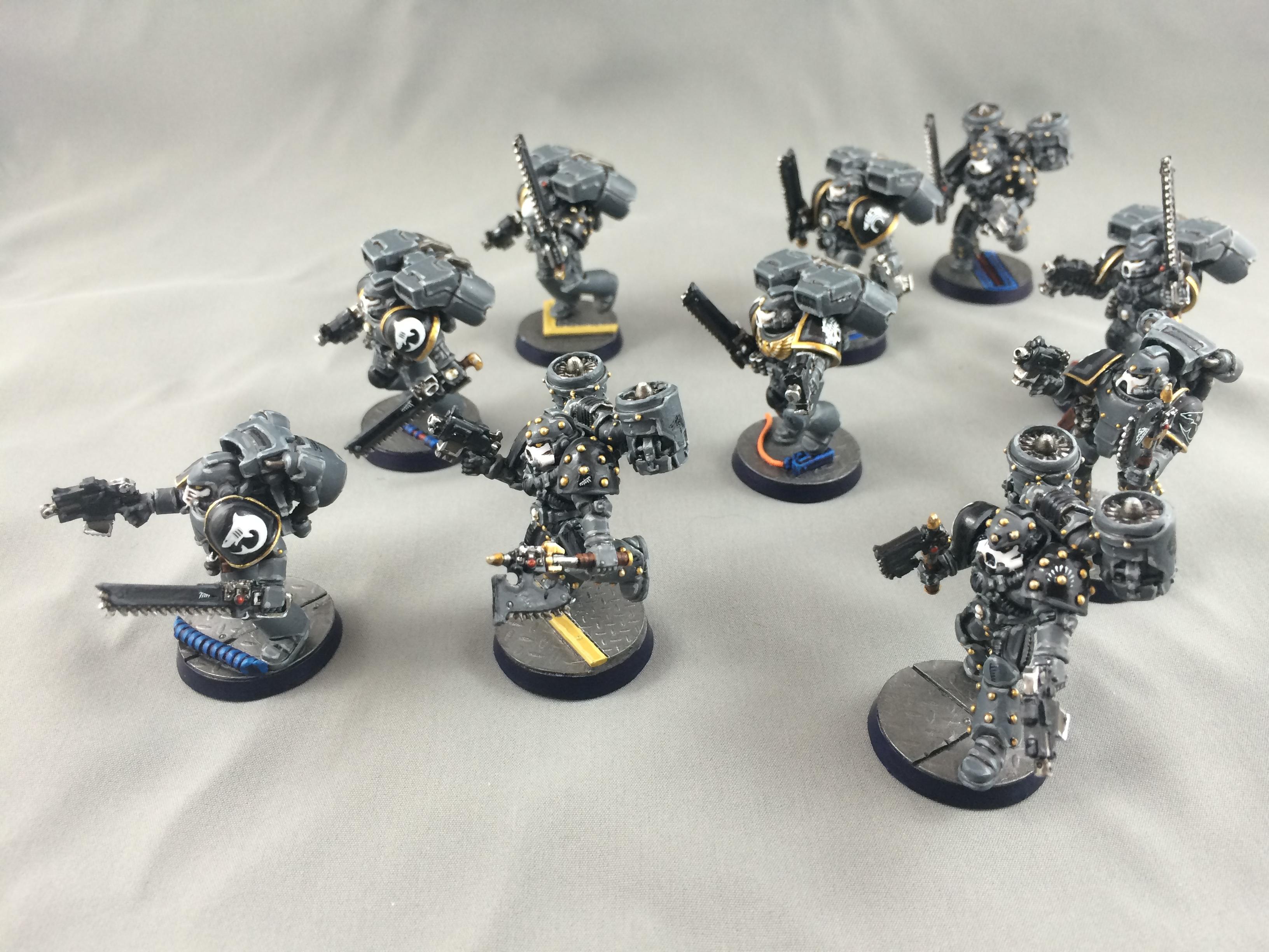 I’ve only played one game with this unit. They got a bit of a boost with invisibility to keep Logan Grimnar and Wolf Guard Terminators at bay for a few turns. There is a mixture of Mk IV, Mk V and Mk VI power armour. The Sergeant’s helm has black on it to differentiate from the rest of the squad. Three models are magnetized to change weapon load outs. I pinned the models to the bases. The bases look great but the models pop easily off them. I’ve found that pinning the models to the base has helped.