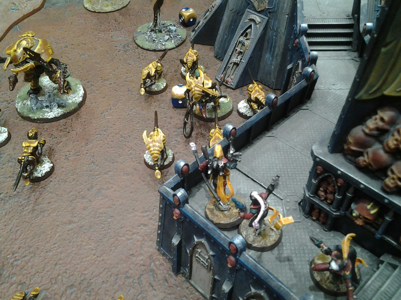 The Shadowseer casts Shards of Light on the Prime and brood and kills the five Termagants and puts a wound on the Prime. The Fire Prism shoots the larger brood and kills five Termagants.