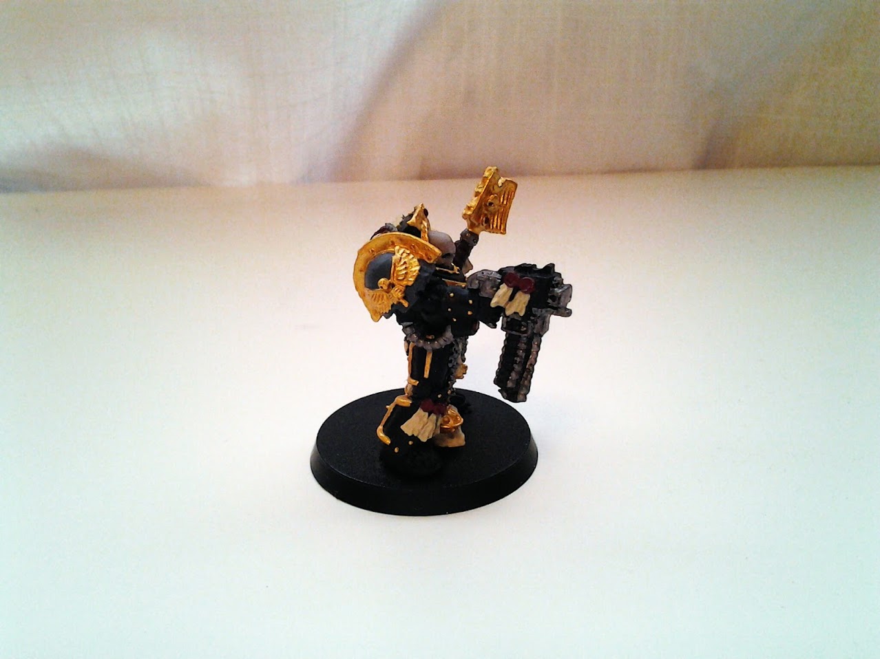 I didn’t think I had the luxury of time to research what to do in the event of dropping a model covered in varnish in dirt. I had a bucket close by so I filled it with water and decided to give the Chaplain a bath in hopes to get the dirt off. Well, mixing water and varnish was not exactly the smoothest operation. That being said I was able to get most of the dirt off. I tried to dry off most of the water and then crossed the fingers that the model wasn’t ruined. The only thing I could do at this point was wait. I returned to the Chaplain the next day and the model was salvaged. There was some dirt stuck in the varnish but I knew I could paint over it. I dodged a bullet with this one. I hope to make some Tau suffer with this mistake.