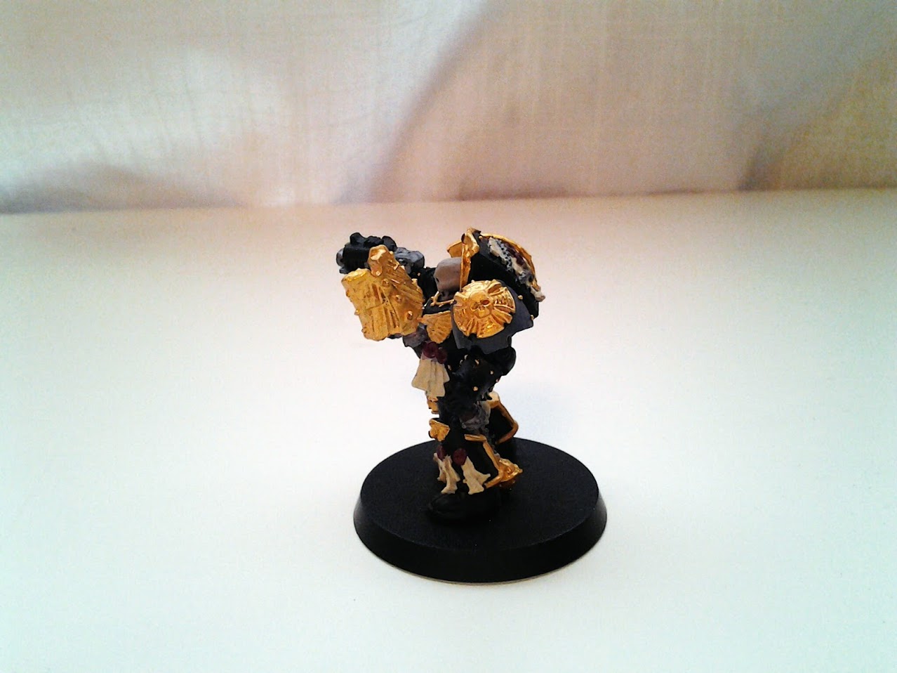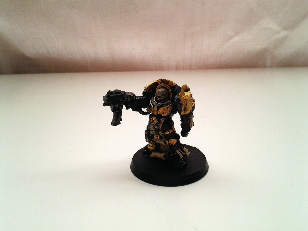 Here I have all of the base colours on. All paints are Citadel- Burnished Gold (old line), Mechanicus Standard Grey, Rakarth Flesh, Scab Red (old line), Bleached Bone (old line) and LeadbelcherThe plastic base is temporary.