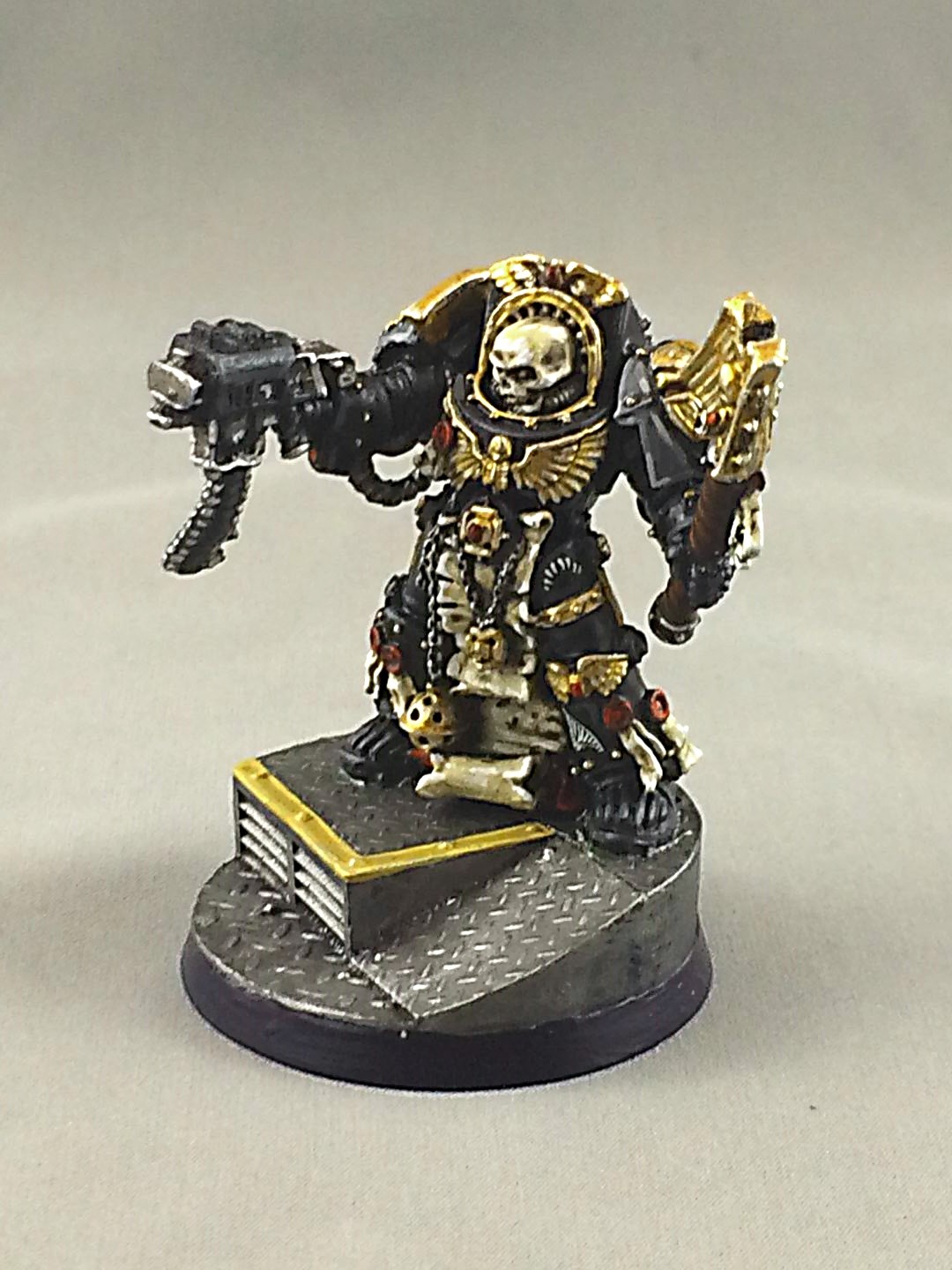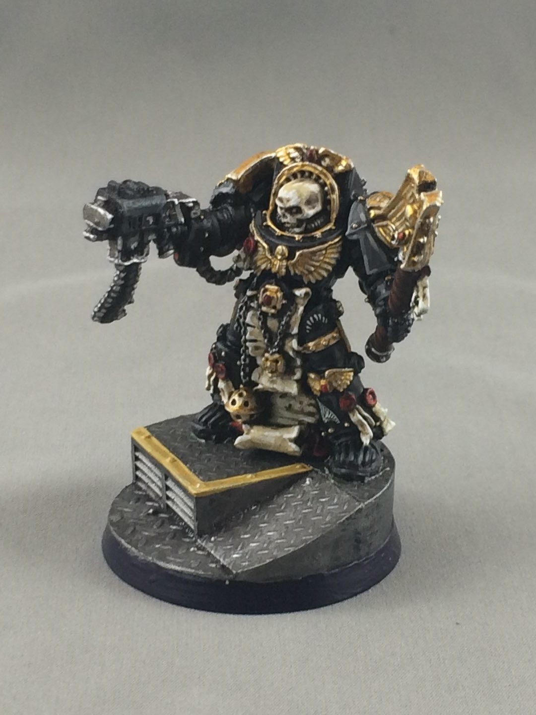 The Terminator Chaplain is complete.  I am really pleased with how this model turned out, especially the skull helmet.  Painting black armour was a nice change from the grey.  The black and gold plus the white scrolls complement each other well.  Now I have to release this fellow to do some clobberin’.