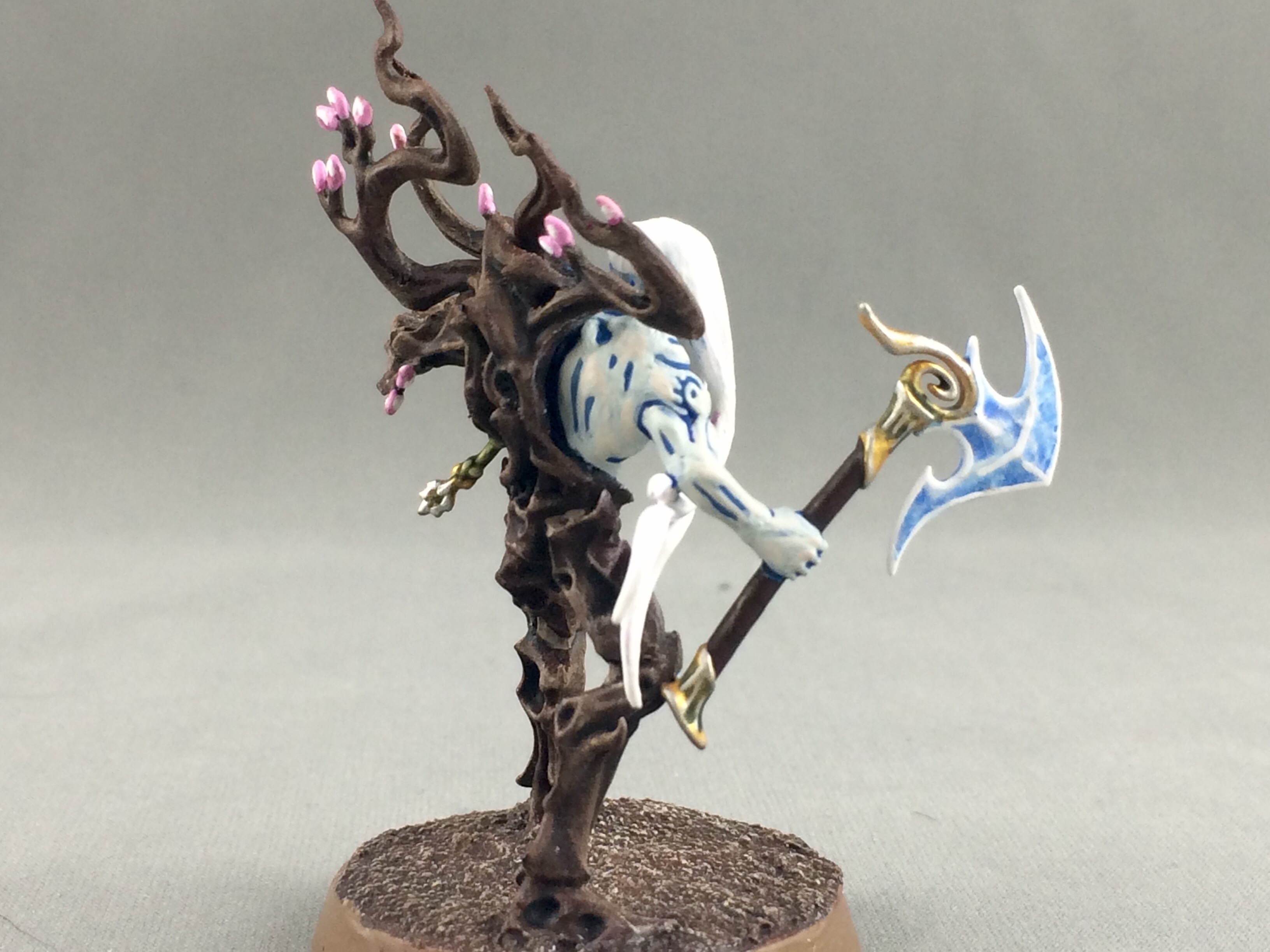 The grey has a blue tone to it so to break it up I applied a final highlight of Pallid Wych Flesh. It is very subtle with the Ulthuan Grey and helps tie the blue in with the pink cherry blossoms.