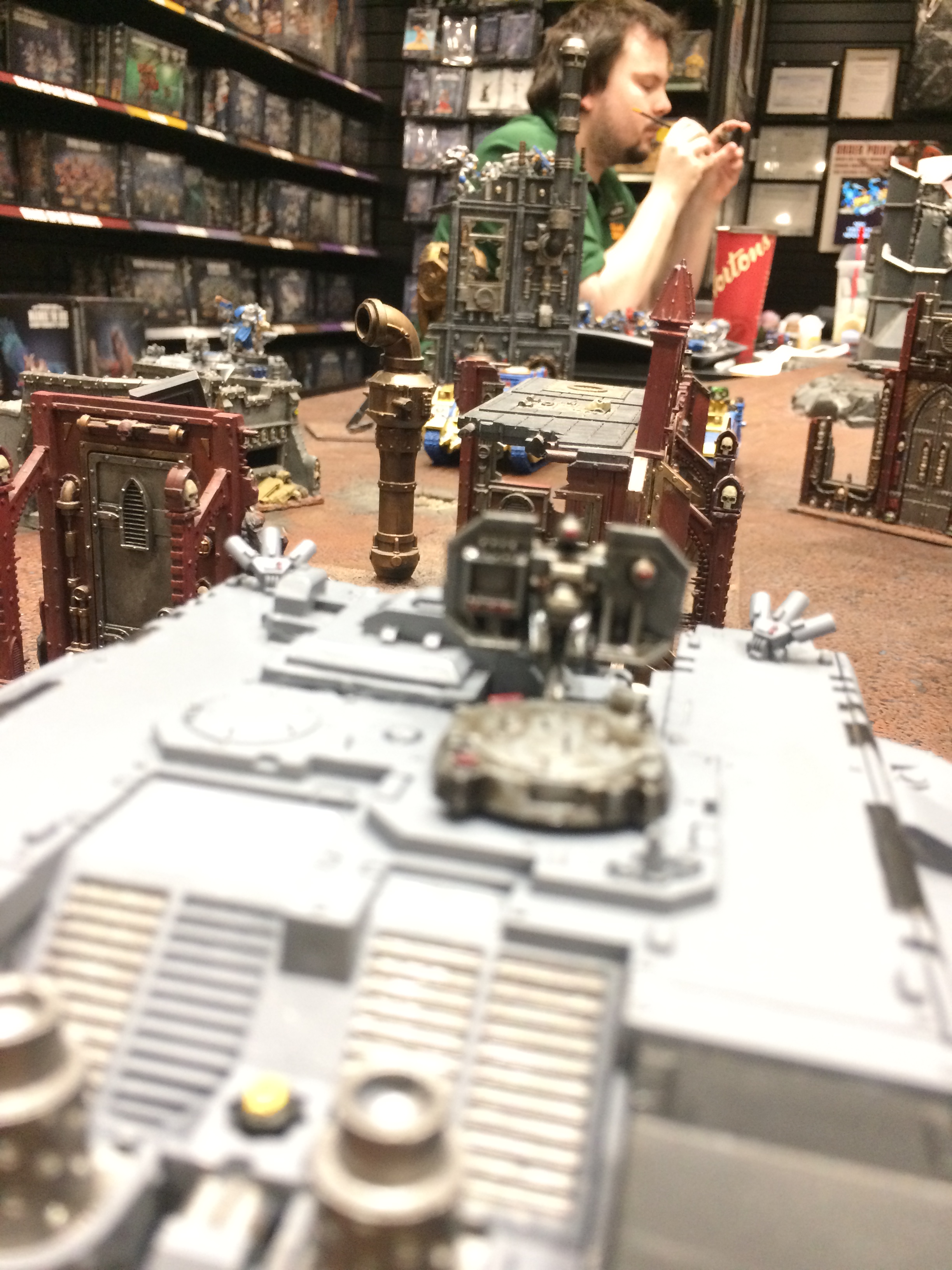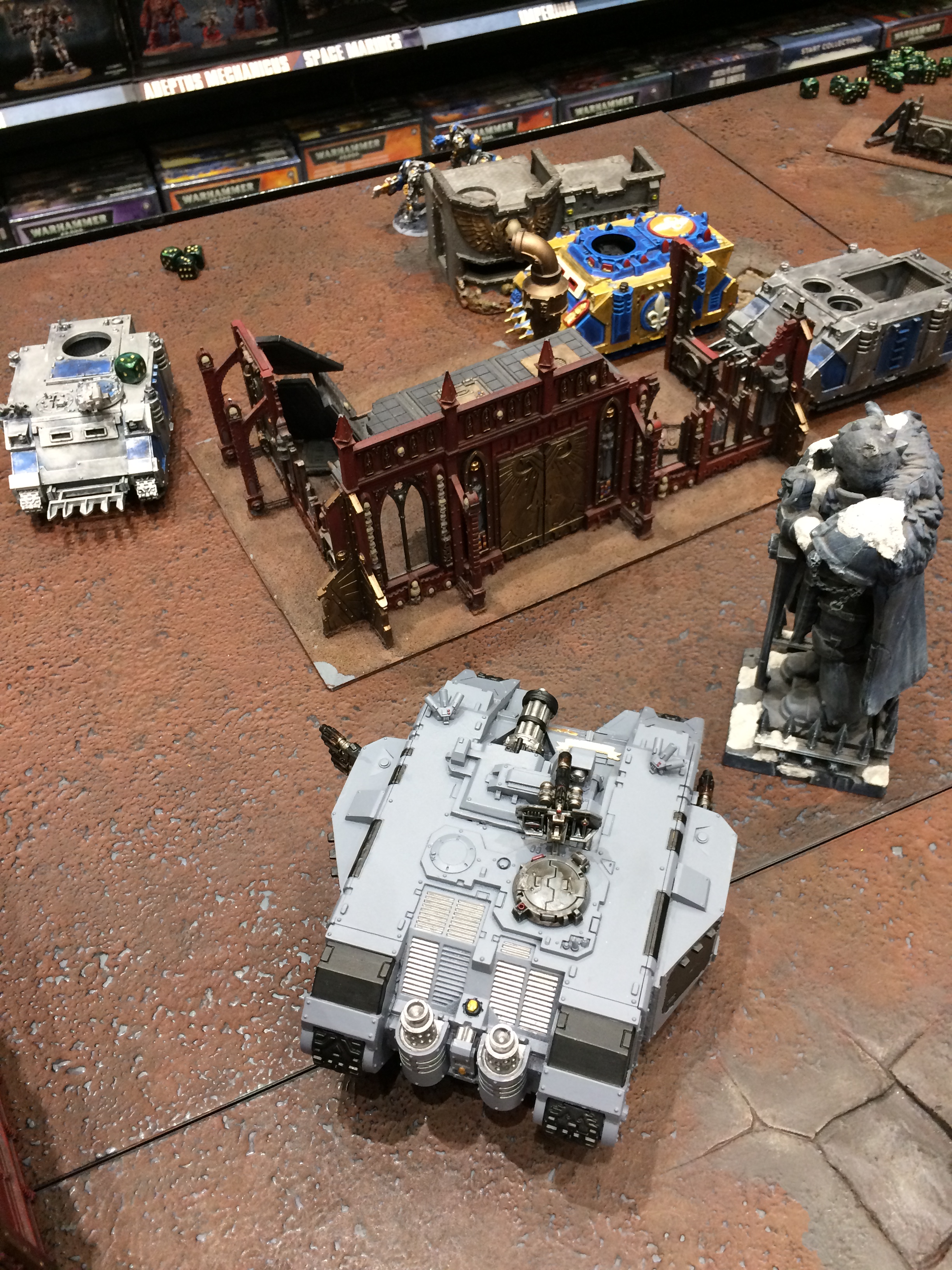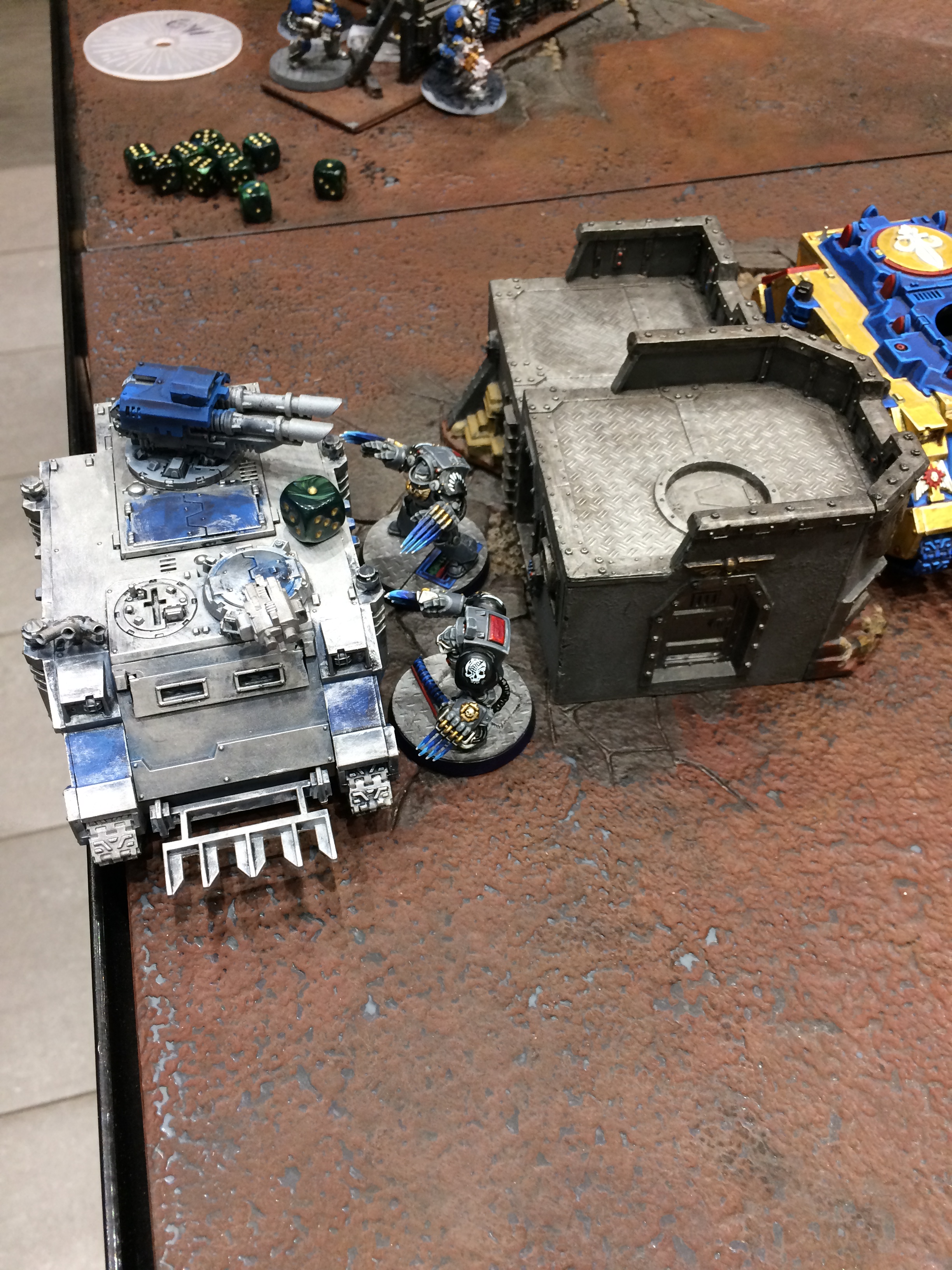 The bomb toting Rhino that escaped the thunderhammer Terminator cruises forward.  It uses the tower to hide from the Devastators.