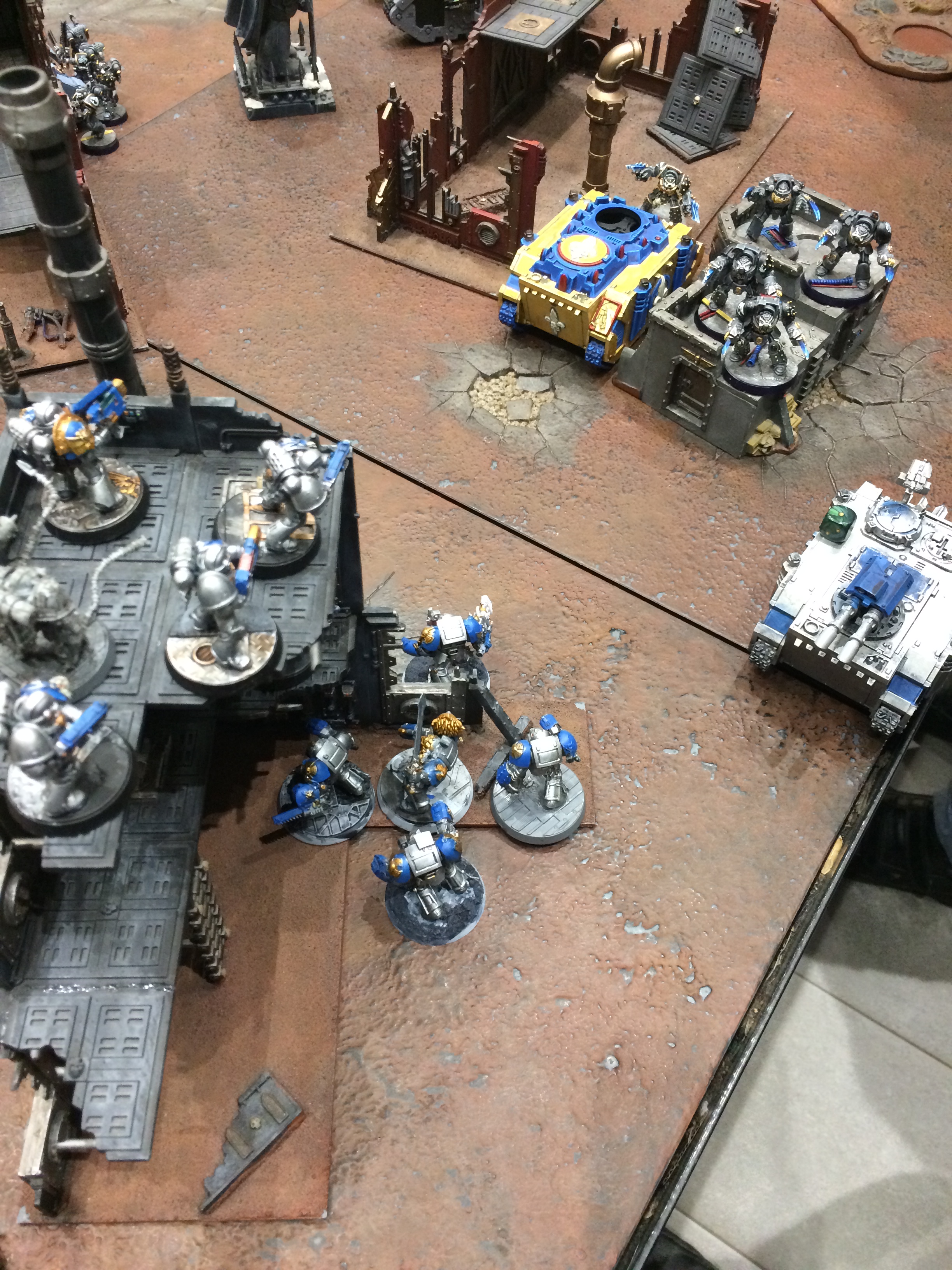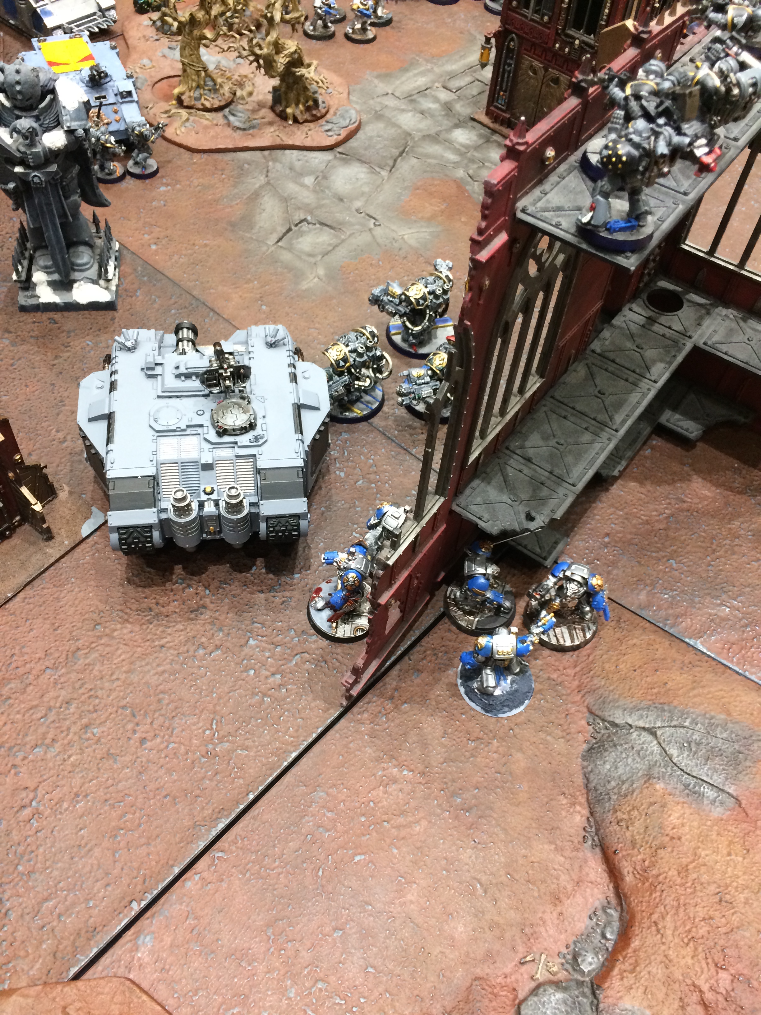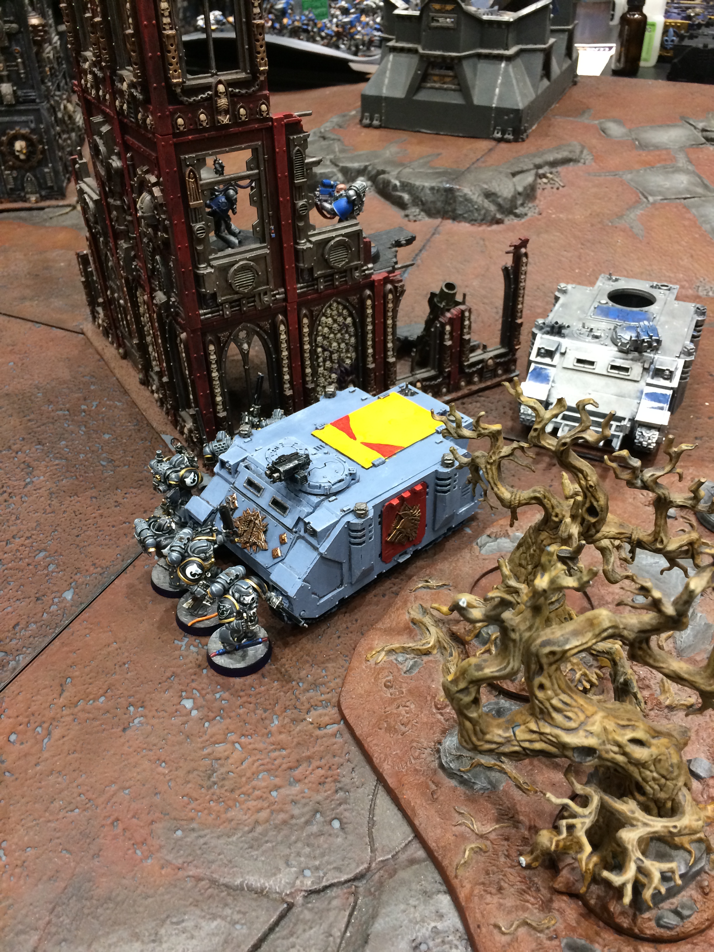 I advance my line forward.  The thunderhammer Terminator’s try to hide behind a tower and make a run towards the block of Rhino’s.