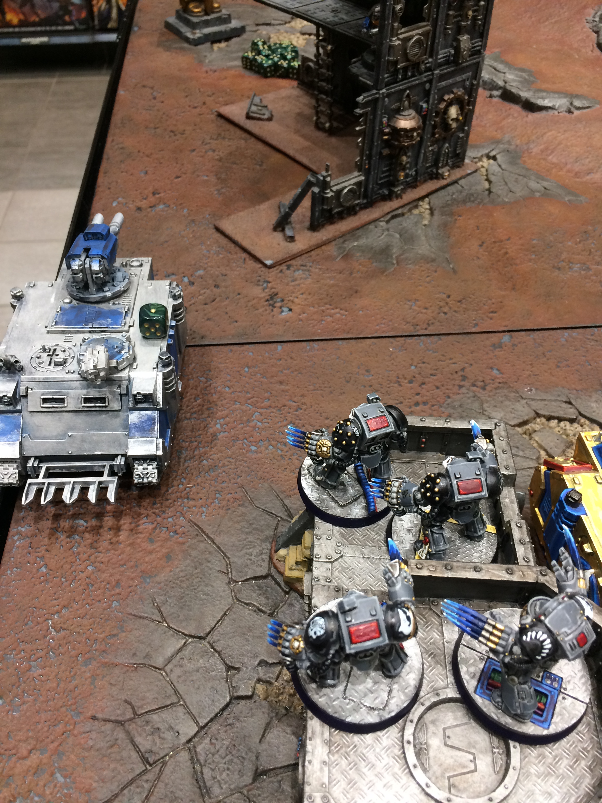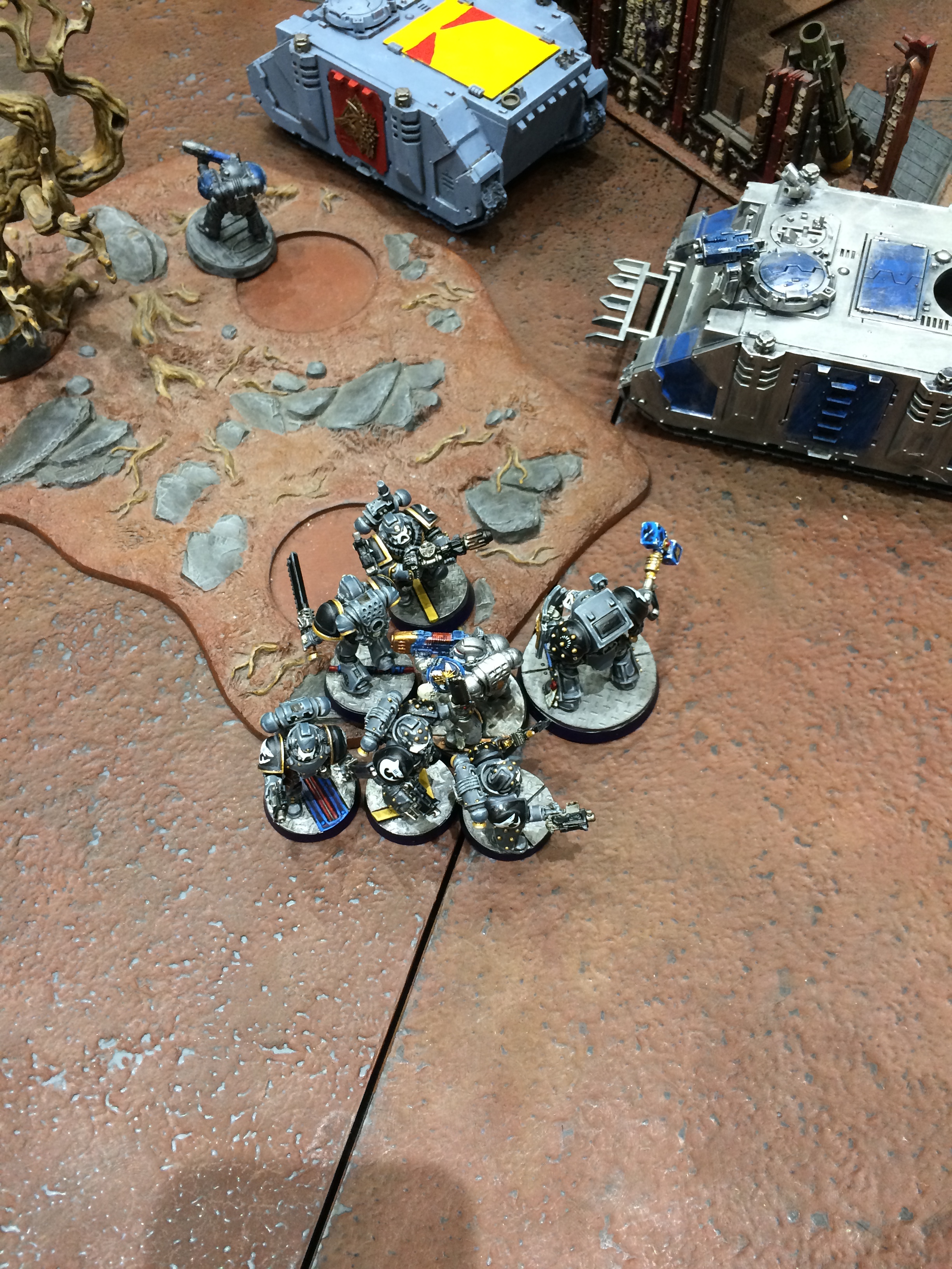Five Astral Claw Tactical Marines emerge from a Razorback that is escorting four Rhino’s.  They take aim at the thunderhammer Terminator’s and kill two.  The Razorback targets the same squad and kills a third.