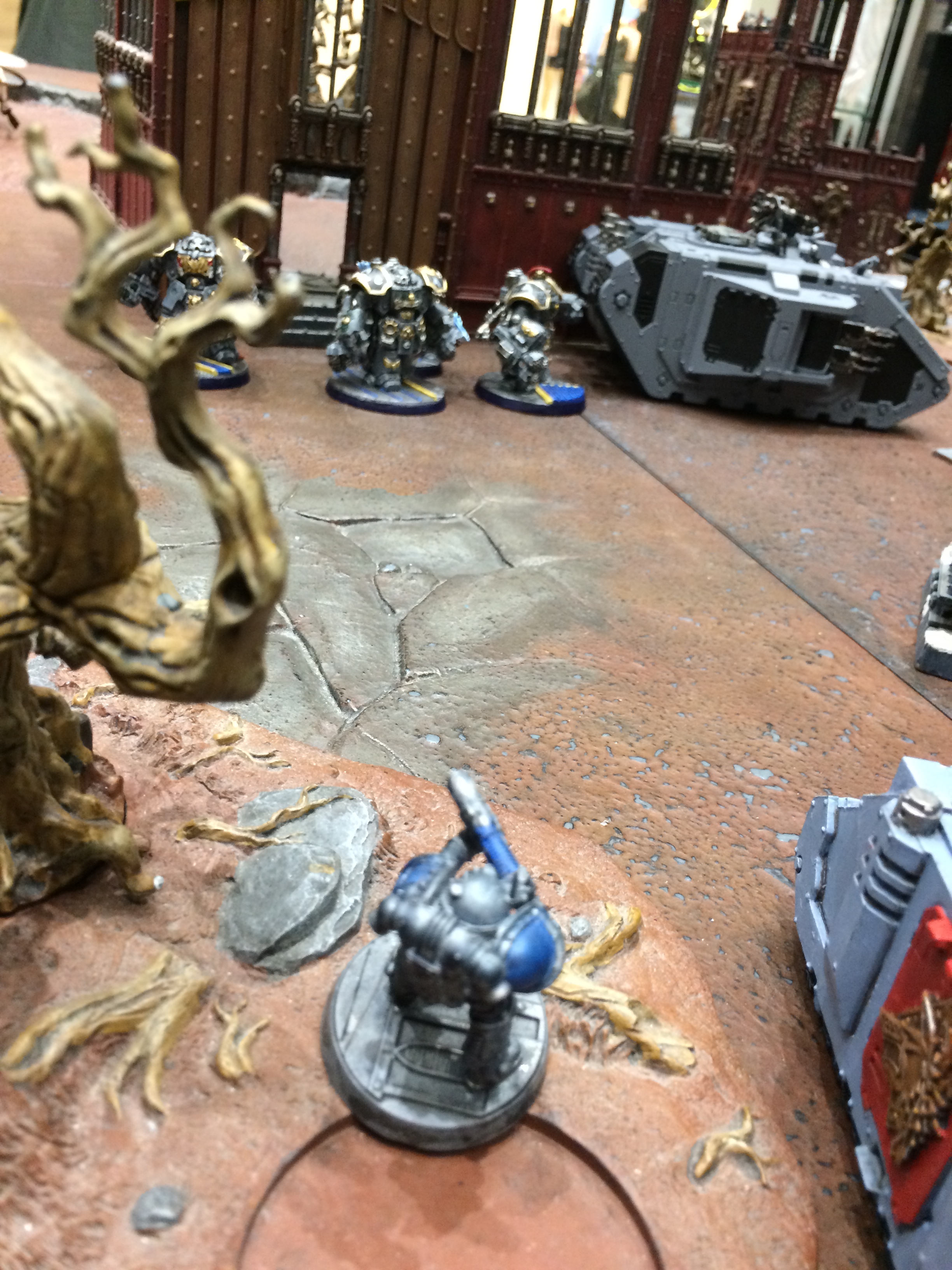 Tyberos knows he does not stand a chance against eleven Astral Claws donning terminator armour.  He makes a run for the Astral Claws deployment zone to act as a deterrent for encroaching Rhino’s.  If only he had an orbital strike to call down.