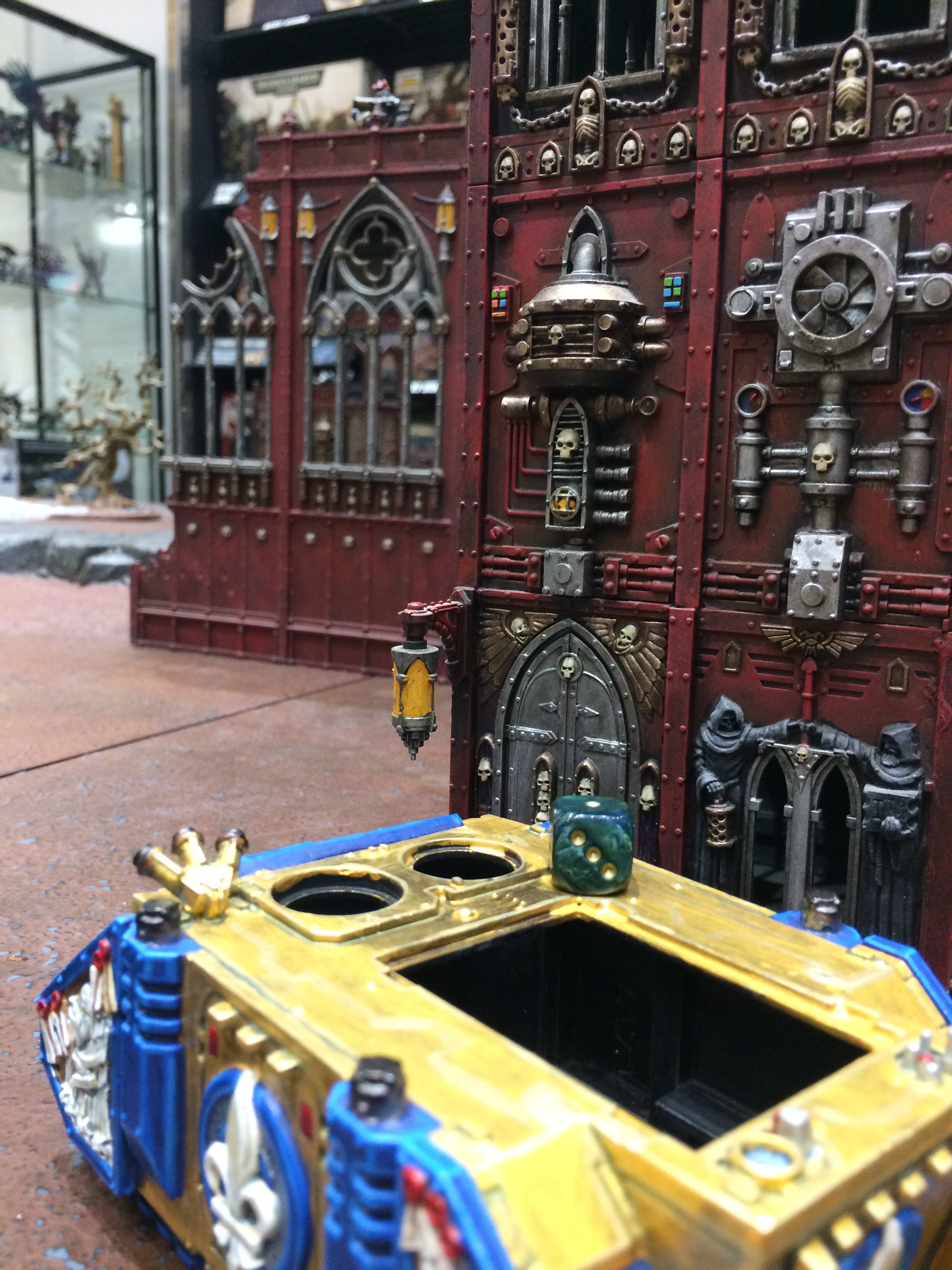 The Land Raider turns its attention to the parking lot of Rhino’s.  Hearing the call for assistance from the thunderhammer Terminator’s, the revered tank answered the call.  The Techmarine was setting the parameters for the thunderfire cannon.  While that was going one the crew fired a multi-melta at the Razorback and exploded it leaving the thunderfire cannon without a target.  The power of the machine spirit was called upon to target a Rhino.  The multi-melta ignites the bomb inside and the explosion kills two marines in the Astral Claws Tactical Squad hiding in the ruins in the center.
