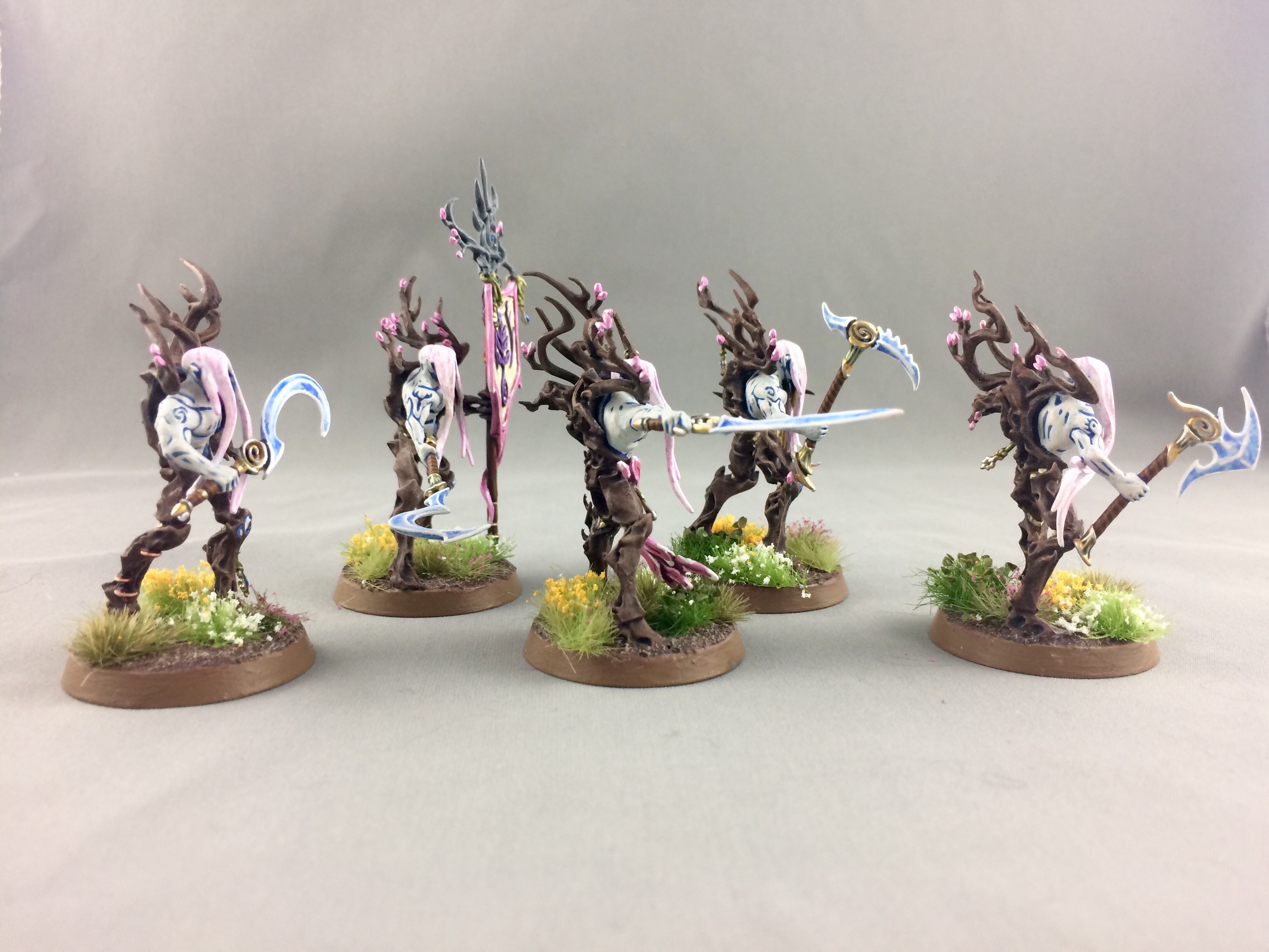 #Squaduary is coming to a close and it is time to showcase some finished units. I’ll start off with the Tree Revenants. These models proved to be a little tricky at the start. I was trying to figure out colours and what would work. They were getting me worked up and after some sound advice I was able to find a good balance. Game wise these lads are super fragile. They get picked on really quick and they don’t have the durability to last. They have to be the ones to get the jump on the opponent. I’ve only been running them as a squad of five so doubling up to ten will make a big difference I hope.