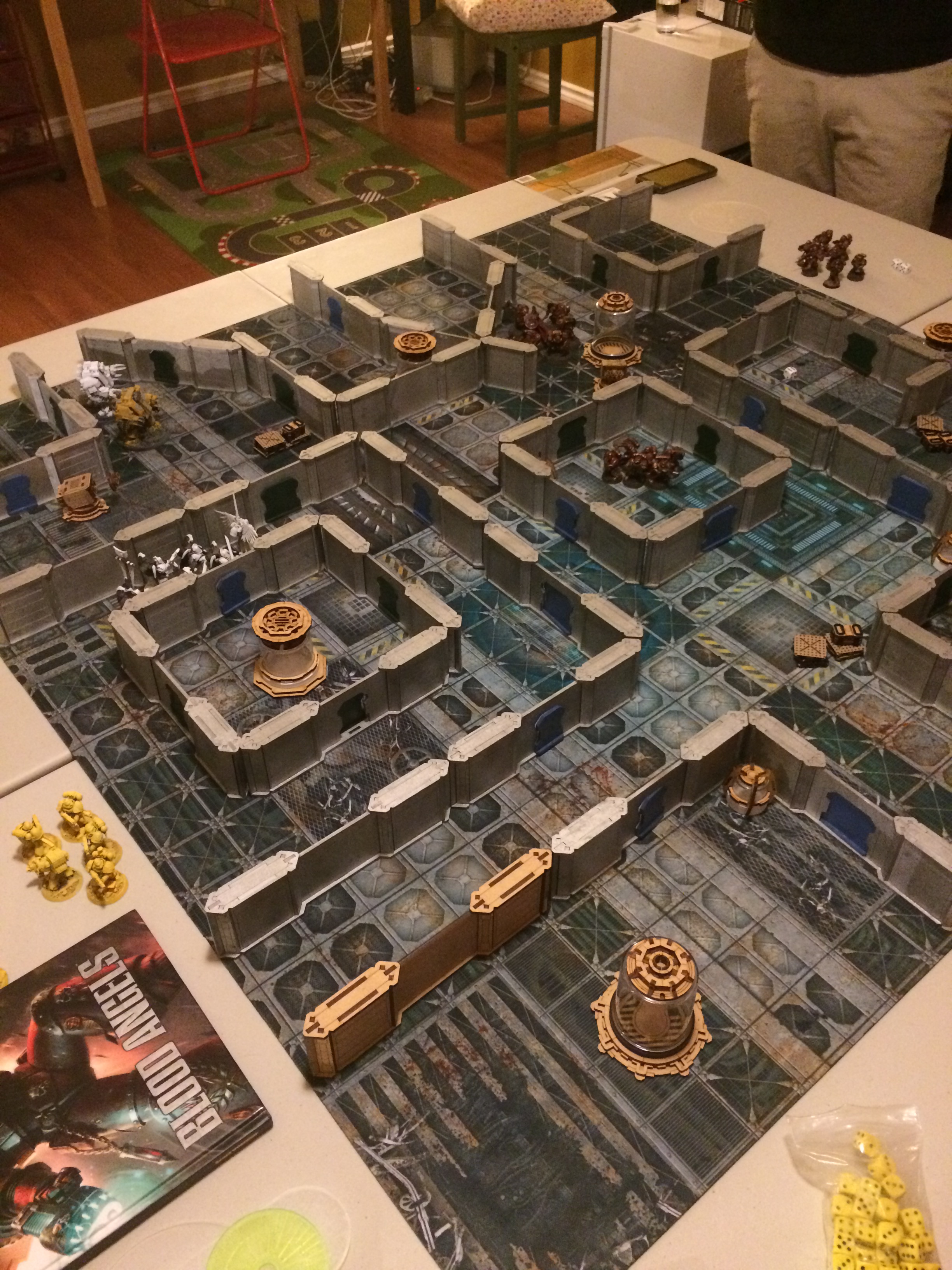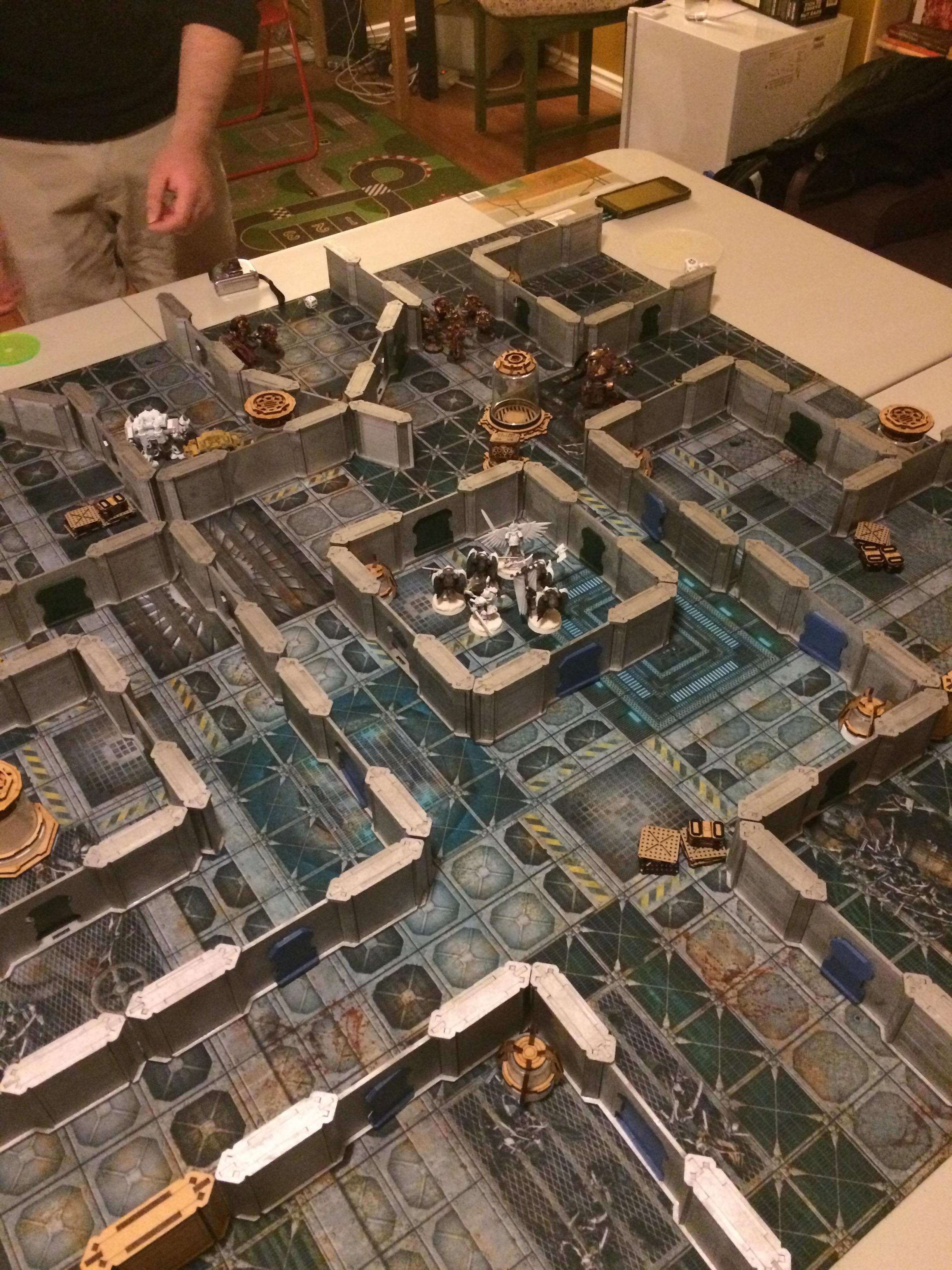 Michael and Will both place their sentry guns in the same long corridor. They have a 24″ range and are 26″ apart. It looks like both sides will have to do some sneaking around. All models can move through the large doors. Only infantry can move through the small doors.