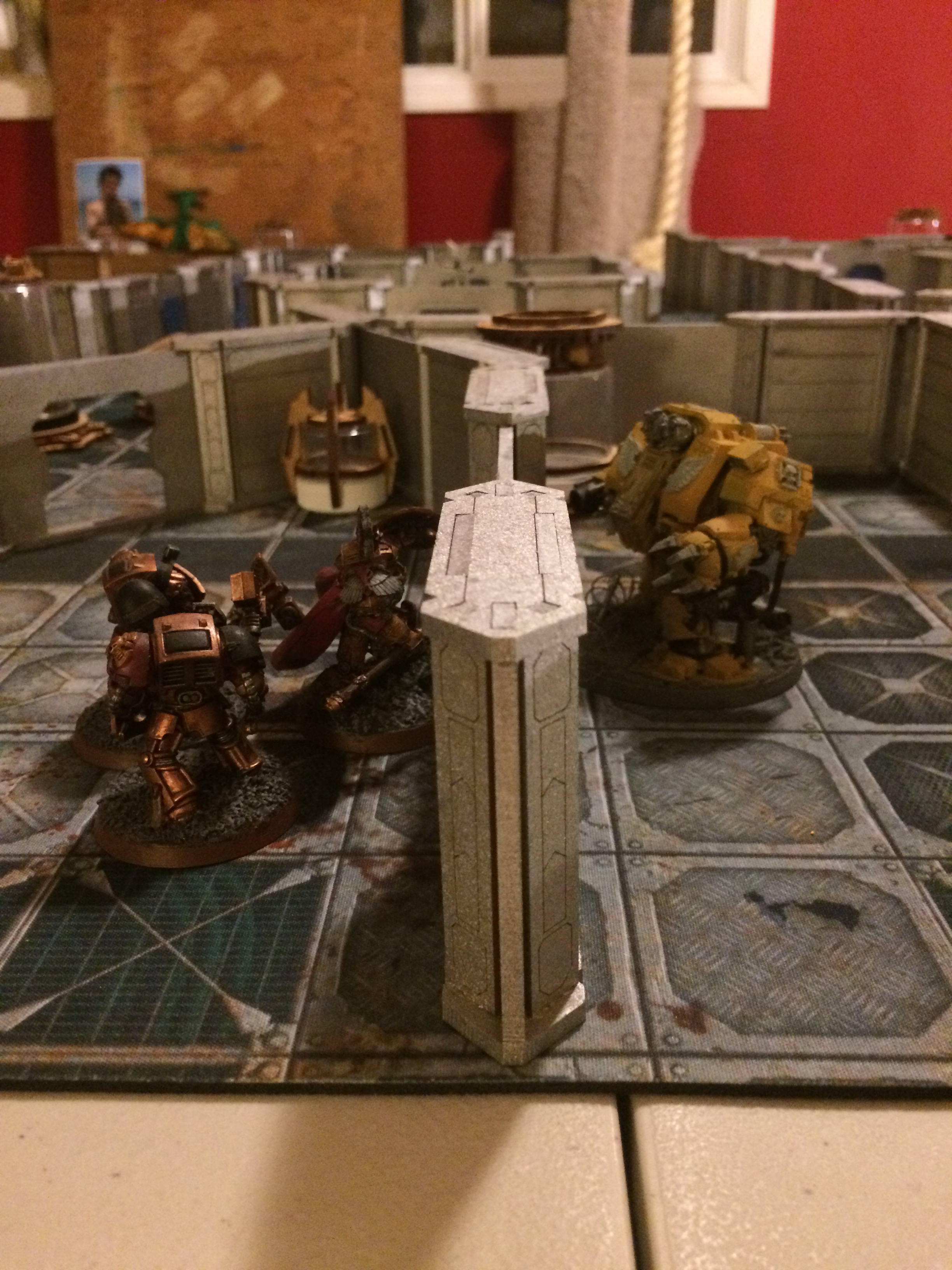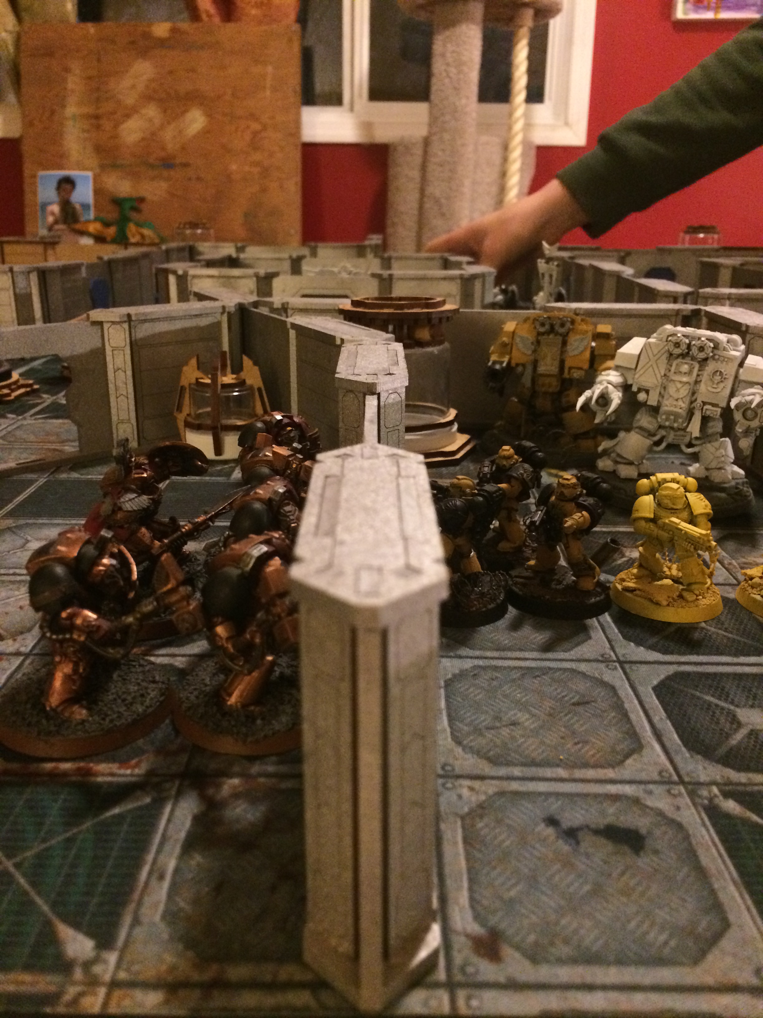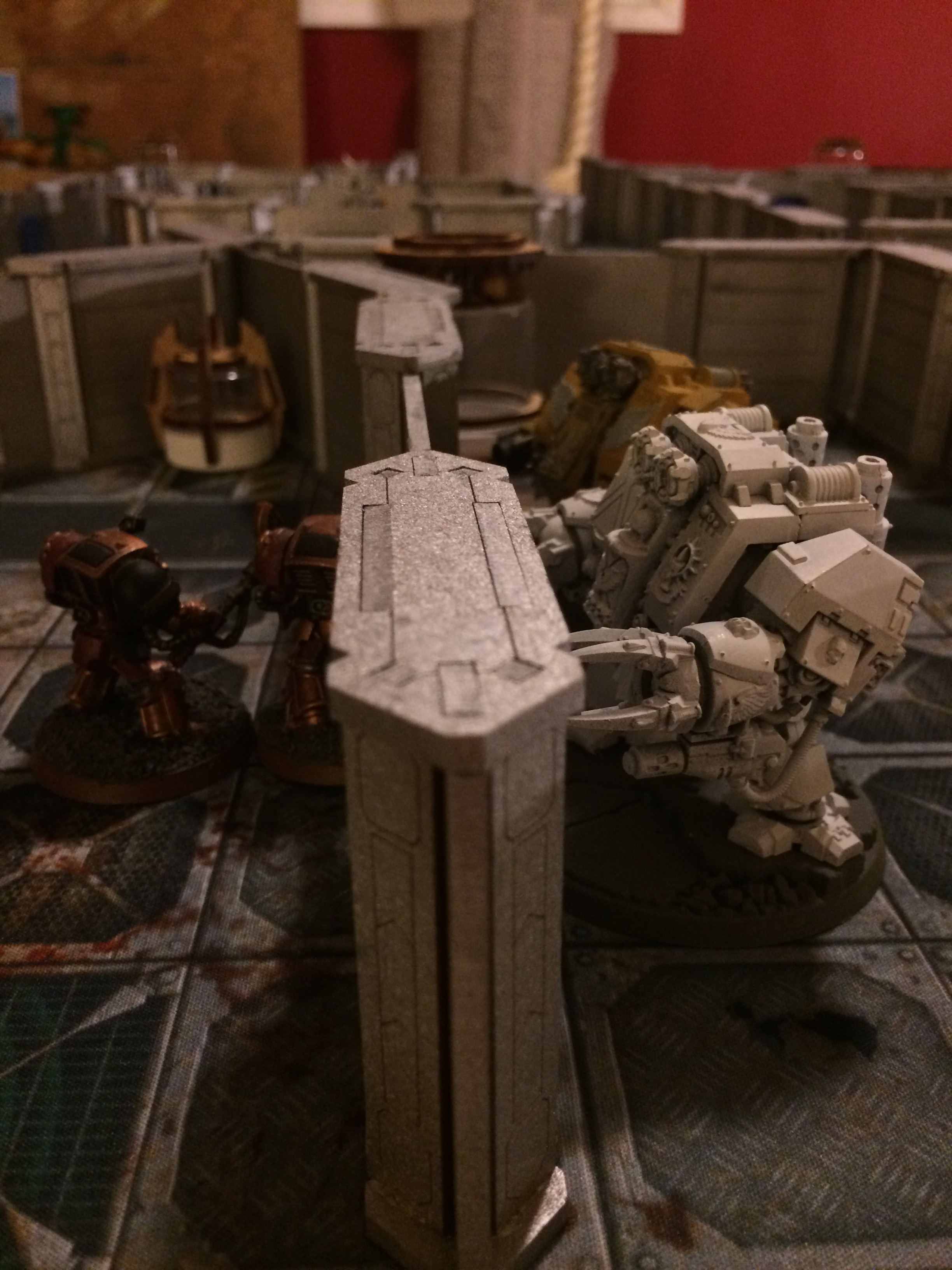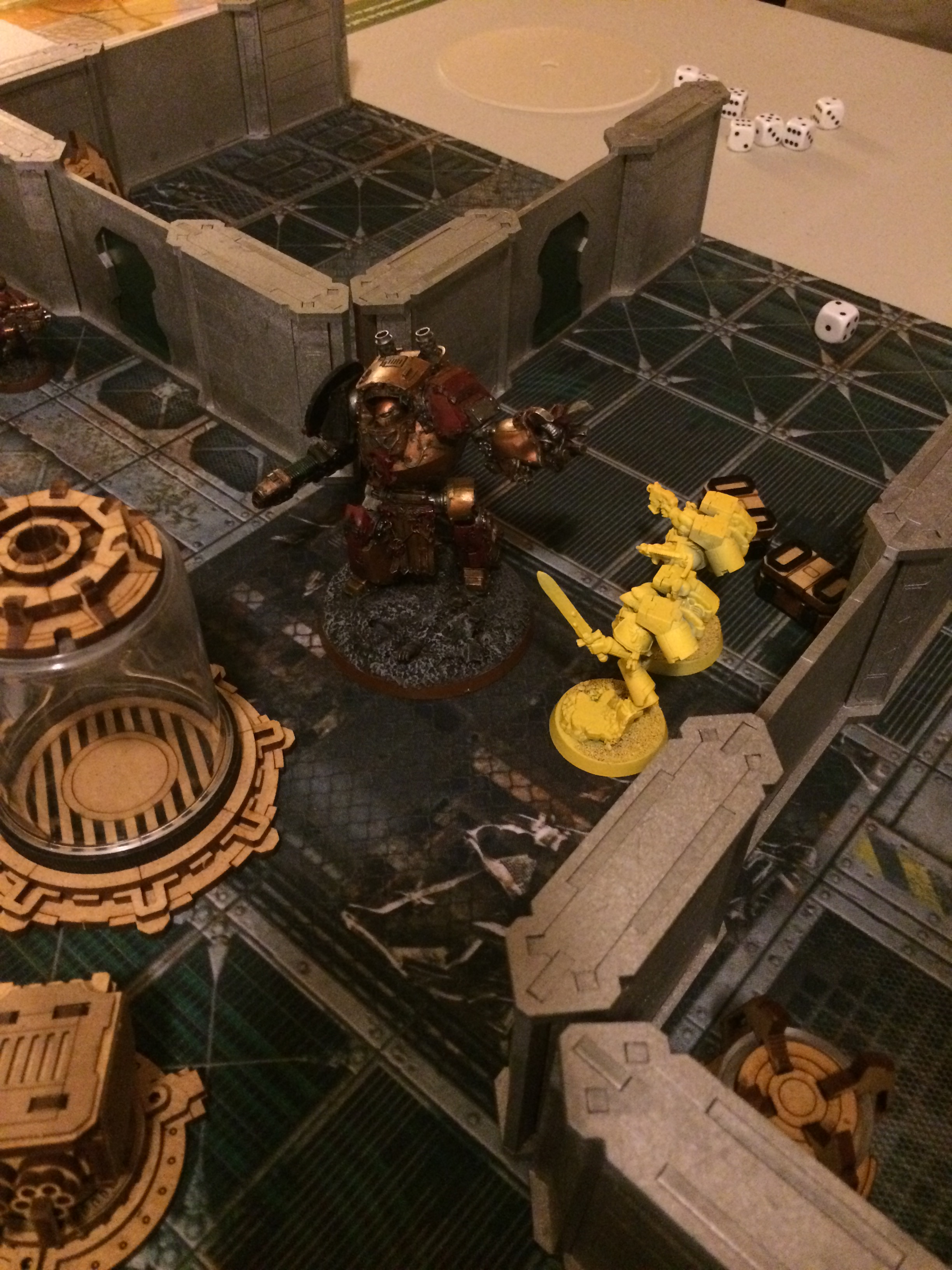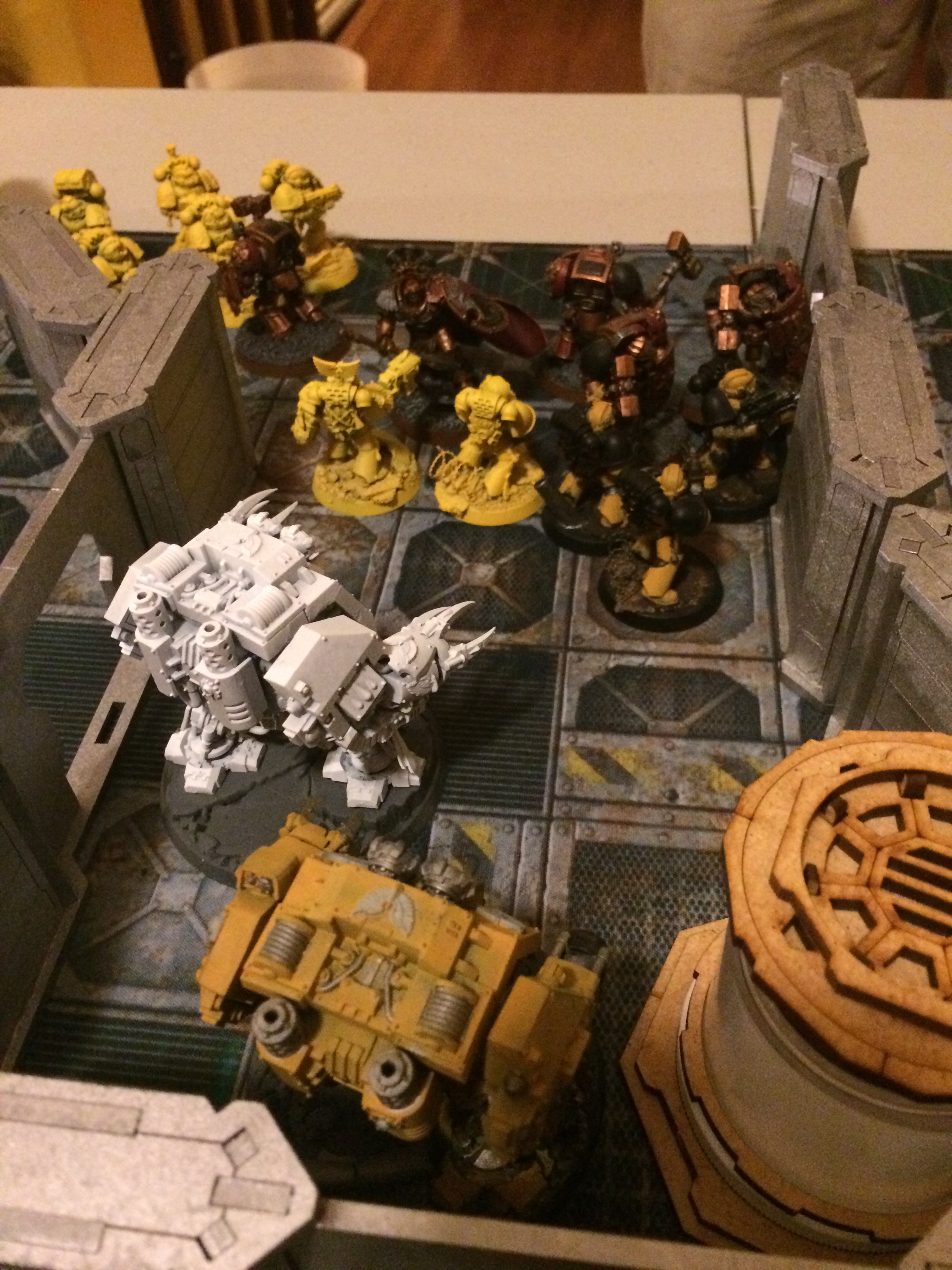 The Lamenters Tactical Marines open the door and light up the Terminators. The Minotaurs make all their saves and prepare for the volley of shots from the Dreadnoughts. They manage to weather the storm.