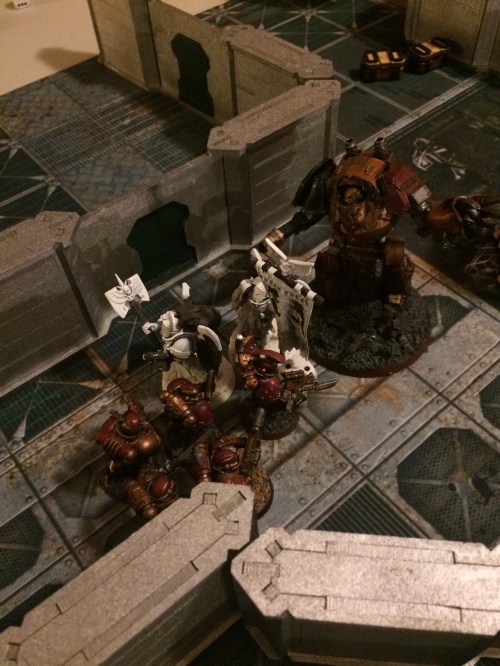 Even though the Tactical Marines were wiped out the Terminators took two casualties in the process. A high price to pay for victory. The Minotaurs consolidate back to the room they charged from since the Dreadnoughts are too big to fit through the door.