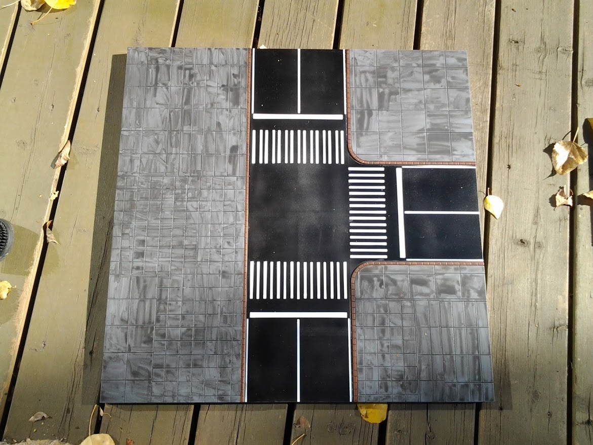 I have completed the next step to finishing the Games and Gears Hawk Urban Battle Boards. Each tile has been shaded- grey concrete with Nuln Oil, grass with Coelia Greenshade, and the brick with Agrax Earthshade. The Nuln Oil looks streaky but I have confidence that it will not be an issue when the project is complete.